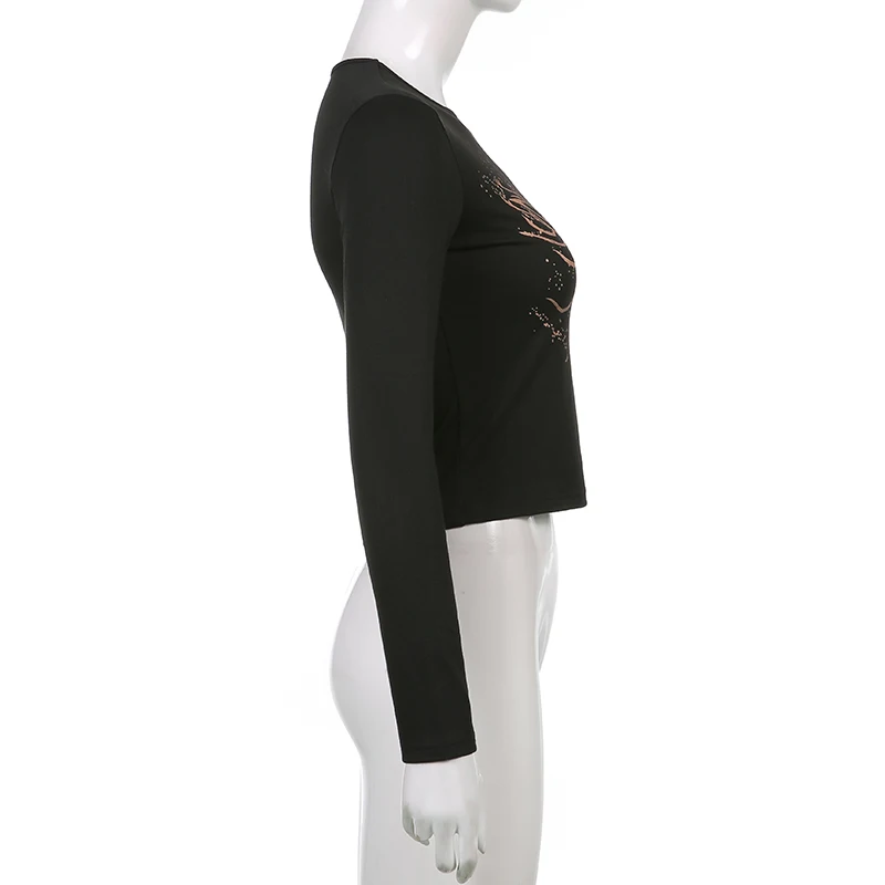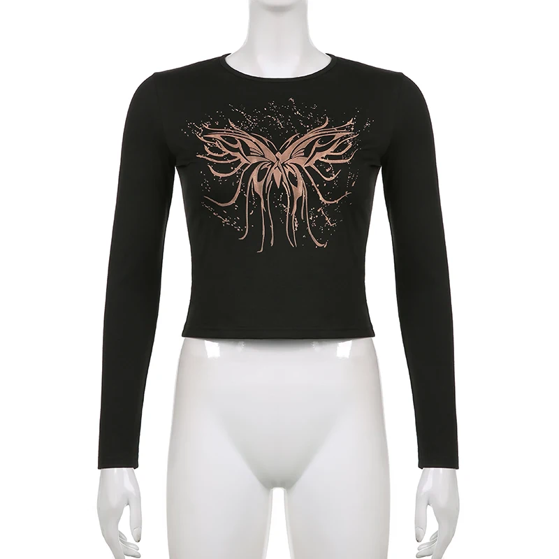 Y2K черная футболка с рисунком бабочки, Осенние облегающие футболки...