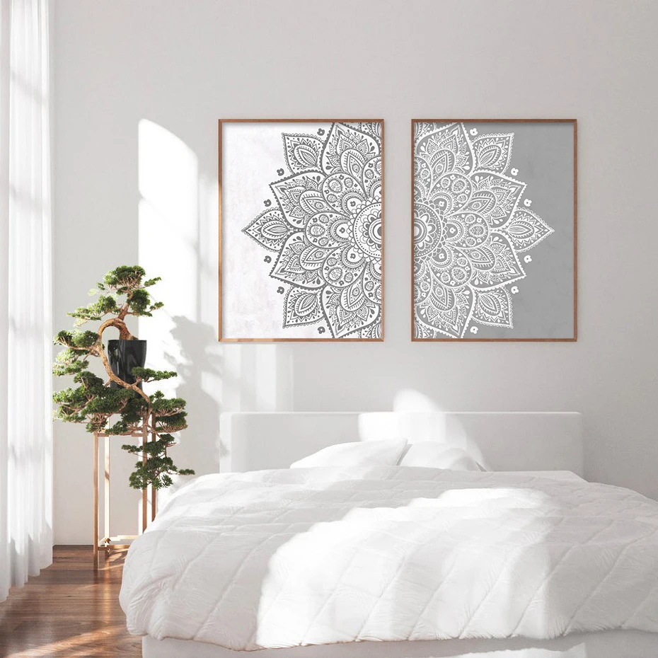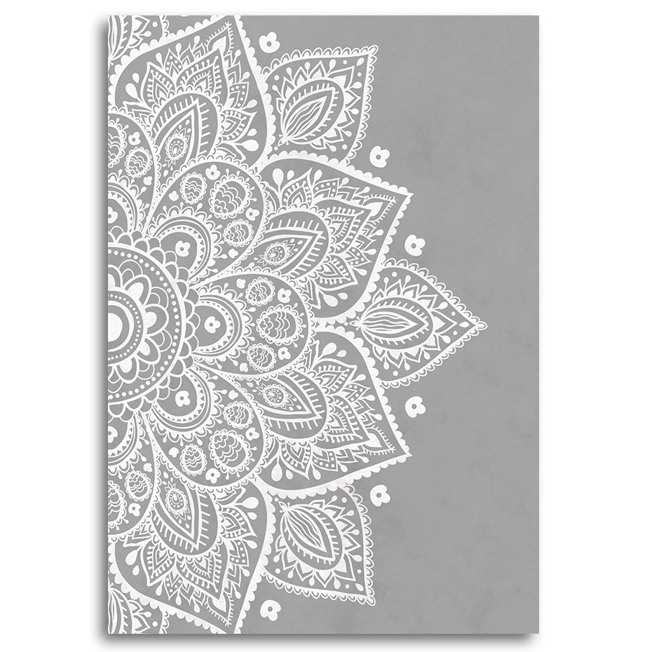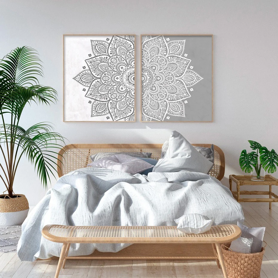 Белая и серая мандала, рисунок на холсте, минималистичный цветочный узор в стиле бохо, настенный художественный принт, декоративный постер для спальни и йоги
