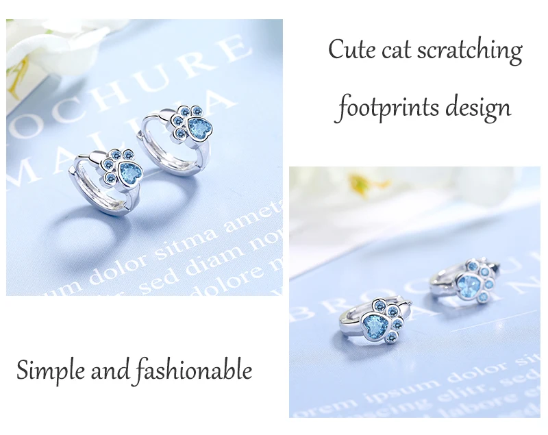 Женские серьги-гвоздики в виде кошачьей лапы, с голубым Цирконом
