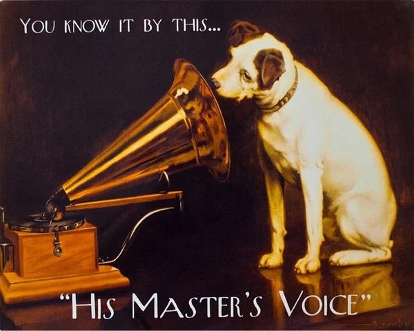 Жестяной знак, искусство, вы его знаете этим, голос его мастера, собака, винтажный металлический жестяной знак, настенный налет