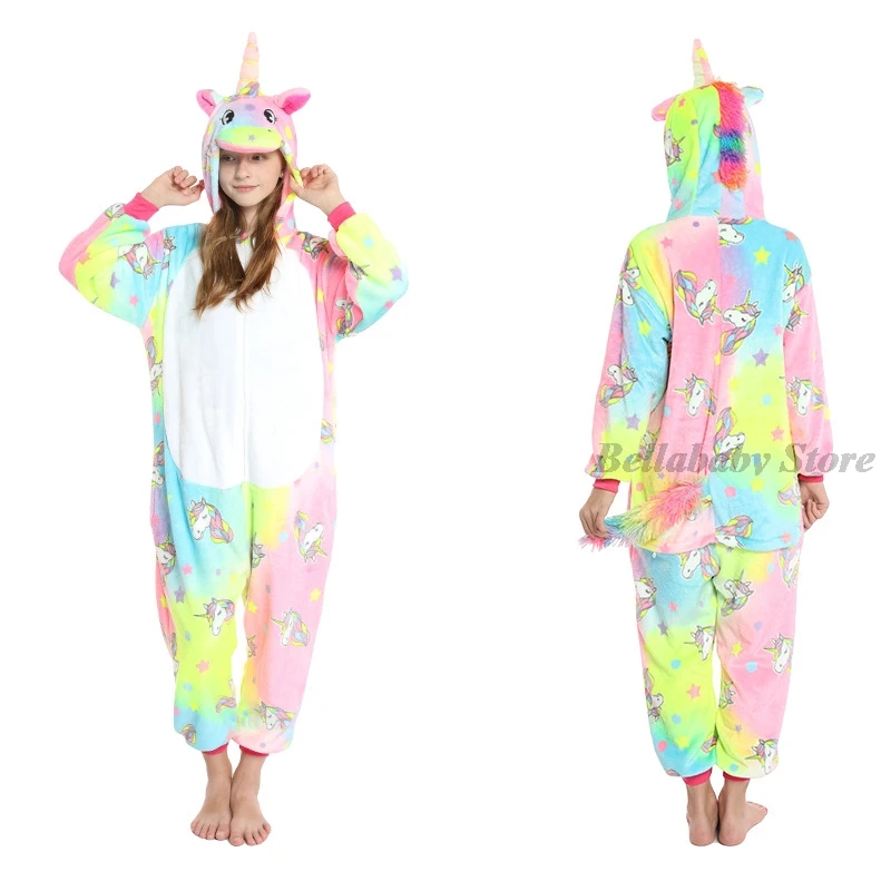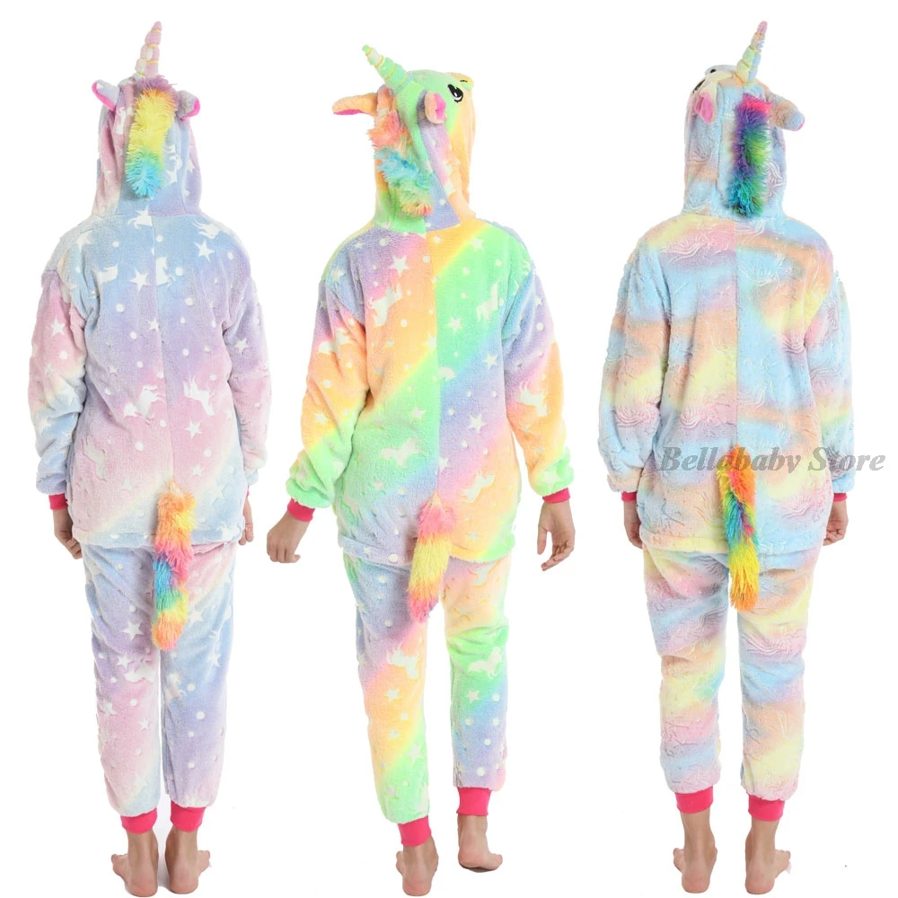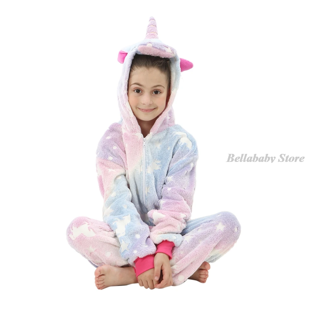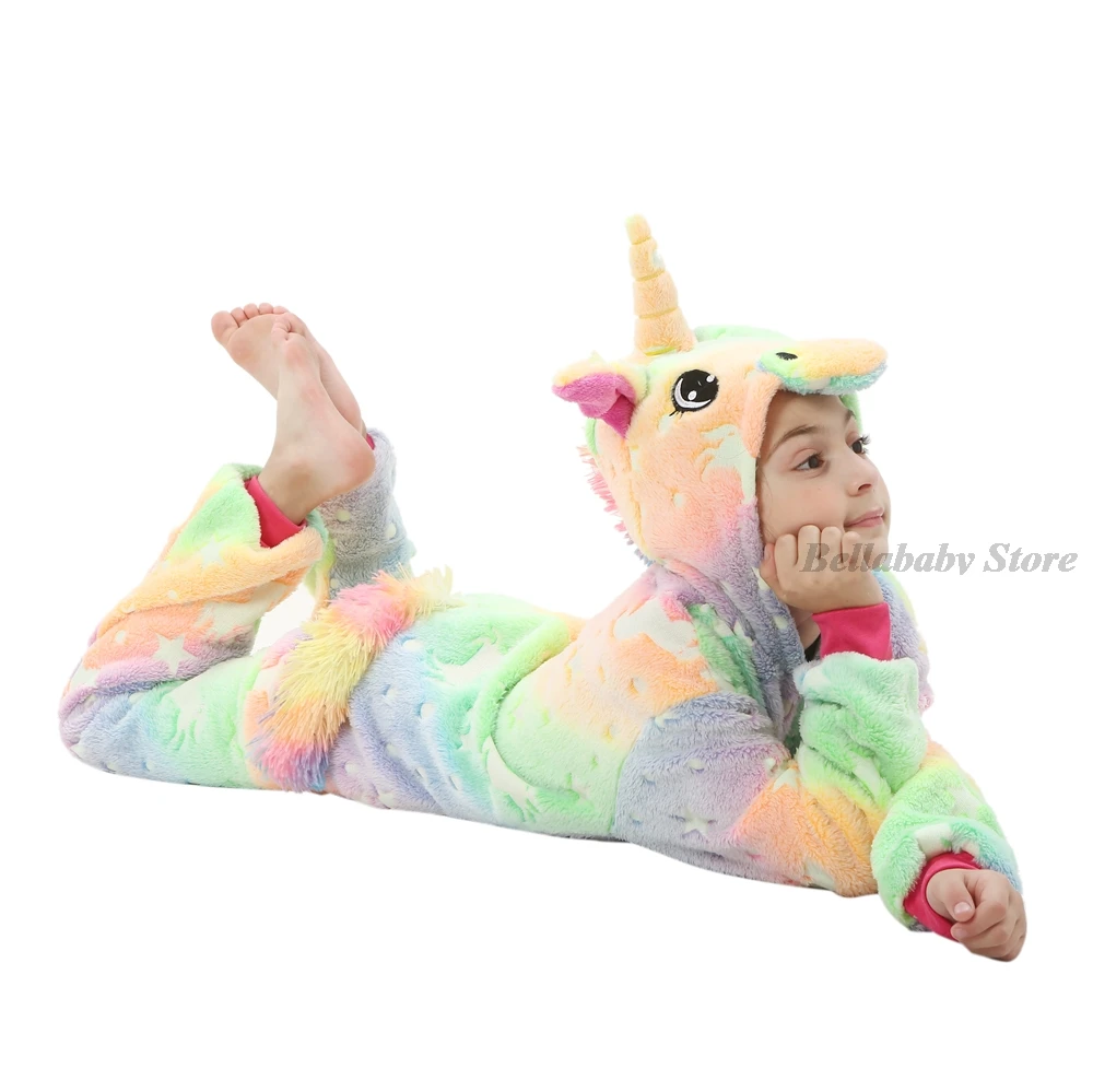 Зимняя фланелевая мягкая теплая Пижама-кигуруми в виде единорога Пижама с капюшоном с животными из мультфильмов для мальчиков Пижама для девочек и детей светящаяся в темноте Пижама-комбинезон