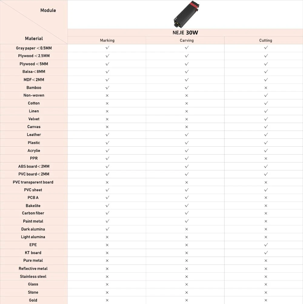 Модель: NEJE Module 30 Вт (N30820)Материал радиатора: авиационный алюминий + латунный корпусСветящийся цвет: синийЛазерный диод: NUBM0A с технологией NEJE CapLD ток: 3.2AРазмер сечения: 30 мм x 30 ммРежим охлаждения: медный сердечник 40 мм + паз радиатора + термосиликоновая смазка + охлаждающий вентилятор 15000 об/минРазмер: 80*30*30 ммIntput напряжение: 12 В постоянного токаГравировка: МДФ/балса/бумага/дерево/ткань/пластик/кожа/Фанера/пенная бумага/анодированный алюминийНе выгравировать: металл/стекло/камень/керамика/PCB/нержавеющая сталь/светоотражающий материал/прозрачный материалТехнические параметры:Вход модуля: 20-30 ВтЛазерный Выход Мощность: 5,5 W (5500 МВт)Длина волны: 455-450нмФорма луча: точка (фокусируемая)Рабочее напряжение: 12 В постоянного токаМодуляция TTL и PWM: Да, Совместимость с модуляцией TTL и PWMВходное напряжение: DC12VPWM/TTL Вход: DC3.3V-12VВходной интерфейс: PH2.0-4Pin (+,-, ШИМ/TTL, температура), 3Pin (+,-, ШИМ/TTL) , 2Pin + 2Pin (+,-) + (ШИМ/TTL,-)Примечание: Температурный интерфейс может быть отключен, NEJE предоставляет текстовые инструкции по приобретению температуры на wiki.Режим привода: внешний ACCБезопасный диапазон температур: <70 ℃Вес модуля: 202 г (чем легче вес, тем меньше инерция движения, тем лучше производительность)Срок службы: 20000 часов Тест:Материал: фанера, толщина 3 ммСкорость 330, резка 3 раза, каждая резка 1,0 ммСкорость 200, в 2 раза, каждом отрезке 1,5 ммСкорость 100, вырезать один раз, вырезать 3 мм каждый раз