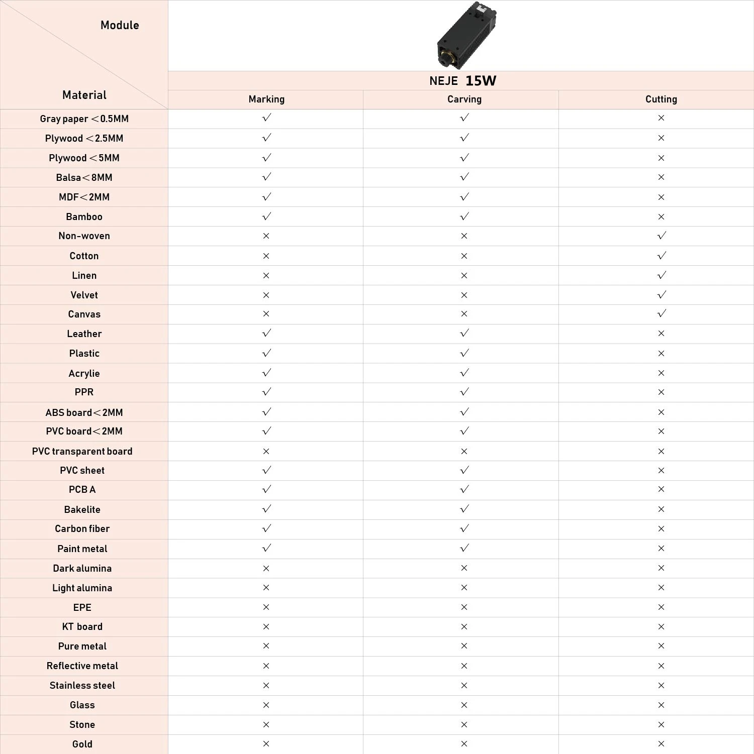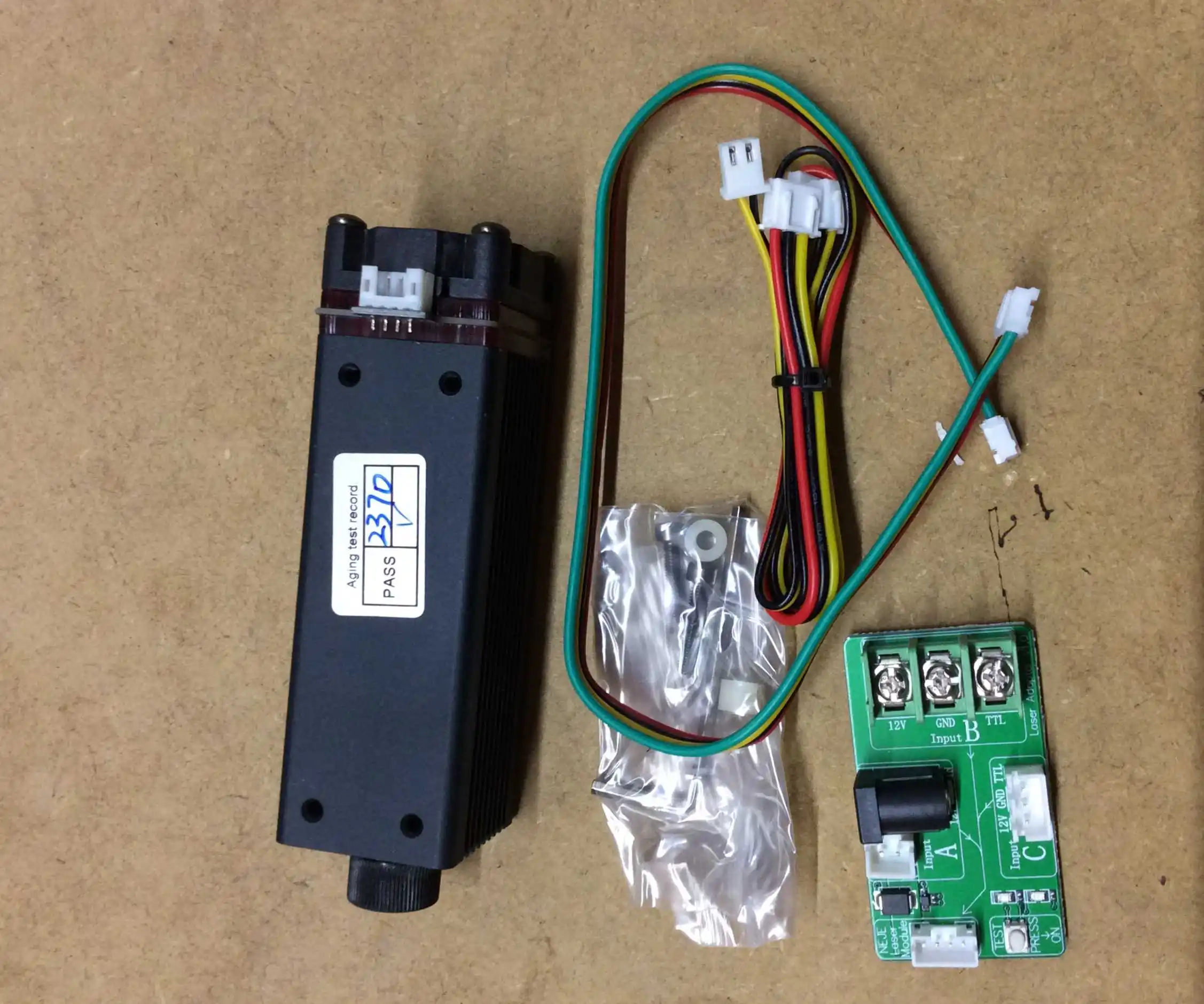Модель: NEJE Module 15W (B30630)Материал радиатора: авиационный алюминий + латунный корпусЛазерный диод: sharp 350 мВт 5,6 лазерный диод (максимальная мощность 405nm 5,6 мм лазерный диод)(Реальный 500 МВт непрерывной работы, другой продавец 500 МВт Nichia 3,8 мм лазер с мощностью всего 200 МВт)LD ток: 350 мАСветящийся цвет: синийРазмер сечения: 30 мм x 30 ммРежим охлаждения: медный сердечник 20 мм + паз радиатора + термосиликоновая смазка + охлаждающий вентилятор 10000 об/минРазмер: 60*30*30 ммВыходное напряжение адаптера: 12 В 2 а постоянного токаГравировка: МДФ/балса/бумага/дерево/ткань/пластик/кожа/Фанера/пенная бумага/анодированный алюминийНе выгравировать: металл/стекло/камень/керамика/PCB/нержавеющая сталь/светоотражающий материал/прозрачный материалТехнические параметры:Вход модуля: 15 ВтВыходная мощность лазера: 500 мВтДлина волны: 405нмФорма луча: точка (фокусируемая)Рабочее напряжение: 12 В постоянного токаМодуляция TTL и PWM: Да, Совместимость с модуляцией TTL и PWMВходное напряжение: DC12VPWM/TTL Вход: DC3.3V-12VВходной интерфейс: PH2.0-4Pin (+,-, ШИМ/TTL, температура), 3Pin (+,-, ШИМ/TTL) , 2Pin + 2Pin (+,-) + (ШИМ/TTL,-)Примечание: Температурный интерфейс может быть отключен, NEJE предоставляет текстовые инструкции по приобретению температуры на wiki.Режим привода: внешний ACCБезопасный диапазон температур: <70 ℃Вес модуля: 115 г (чем легче вес, тем меньше инерция движения, тем лучше производительность)Срок службы: 20000 часов