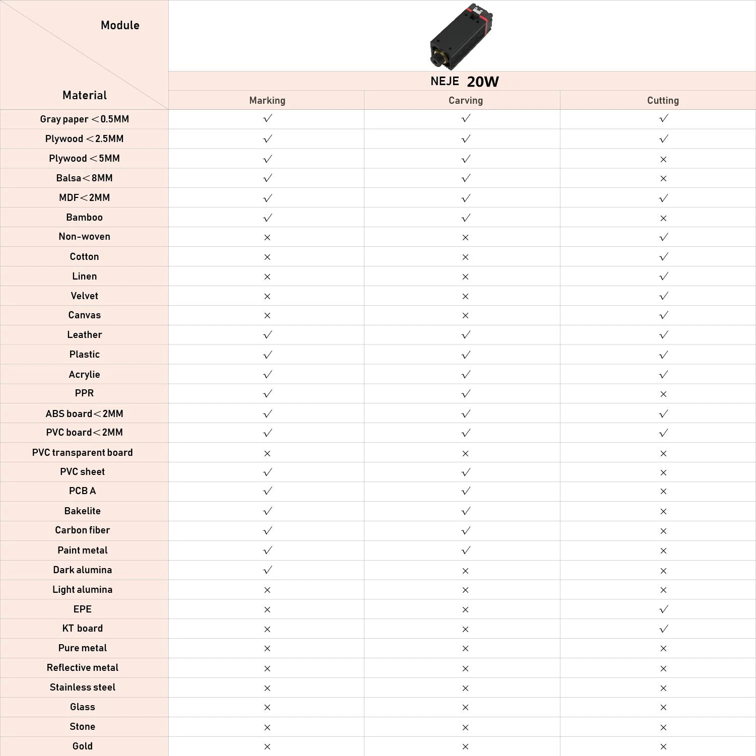 Модель: NEJE Module 20W (N30610)Материал радиатора: авиационный алюминий + латунный корпусСветящийся цвет: синийЛазерный диод: Osram 2,2 W 5,6 мм (максимальная мощность 5,6 мм лазерный диод)LD ток: 1.6AРазмер сечения: 30 мм x 30 ммРежим охлаждения: медный сердечник 20 мм + паз радиатора + термосиликоновая смазка + охлаждающий вентилятор 10000 об/минРазмер: 60*30*30 ммВыходное напряжение адаптера: 12 В 2 а постоянного токаГравировка: МДФ/балса/бумага/дерево/ткань/пластик/кожа/Фанера/пенная бумага/анодированный алюминийНе выгравировать: металл/стекло/камень/керамика/PCB/нержавеющая сталь/светоотражающий материал/прозрачный материалТехнические параметры:Вход модуля: 10 ВтЛазерный Выход Мощность: 2,5 W (2500 МВт)Длина волны: 455-450нмФорма луча: точка (фокусируемая)Входное напряжение: 12 В постоянного токаМодуляция TTL и PWM: Да, Совместимость с модуляцией TTL и PWMВходное напряжение: DC12VPWM/TTL Вход: DC3.3V-12VВходной интерфейс: PH2.0-4Pin (+,-, ШИМ/TTL, температура), 3Pin (+,-, ШИМ/TTL) , 2Pin + 2Pin (+,-) + (ШИМ/TTL,-)Примечание: Температурный интерфейс может быть отключен, NEJE предоставляет текстовые инструкции по приобретению температуры на wiki.Режим привода: внешний ACCБезопасный диапазон температур: <70 ℃Вес модуля: 115 г (чем легче вес, тем меньше инерция движения, тем лучше производительность)Срок службы: 20000 часов