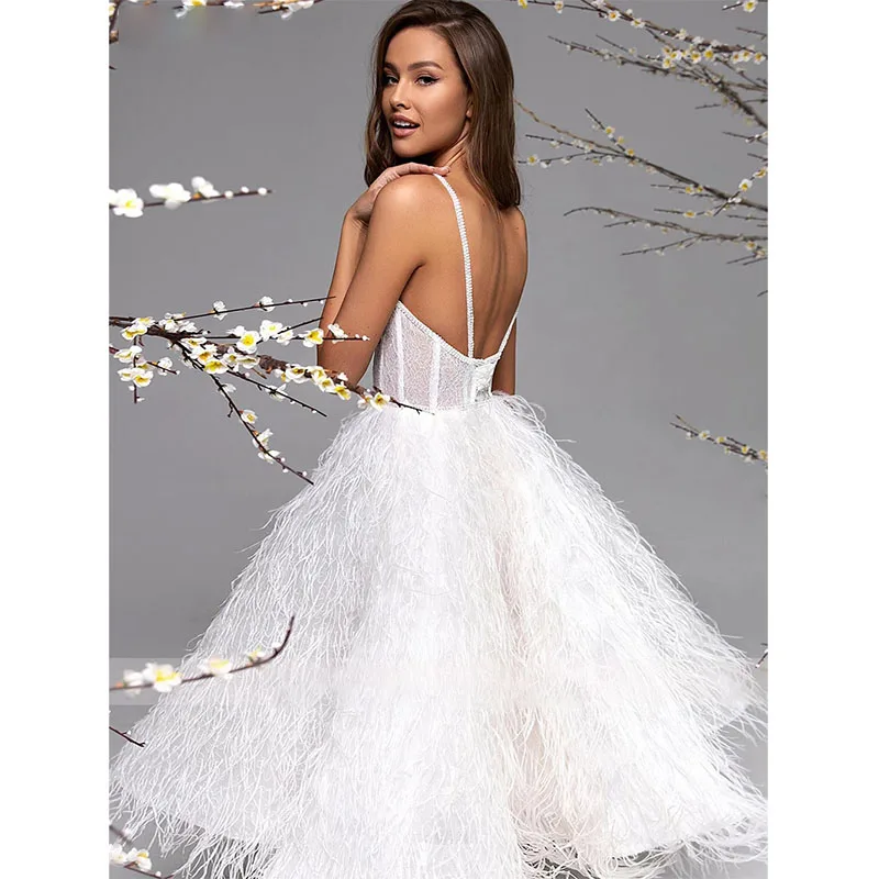 Женское кружевное свадебное платье на тонких бретельках, до колена