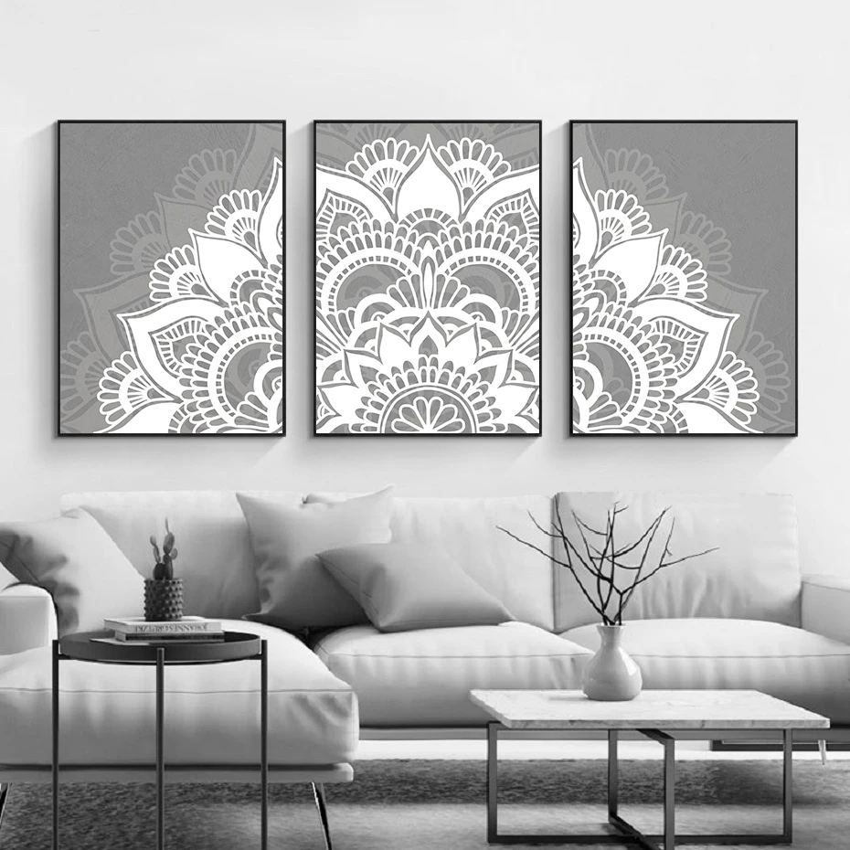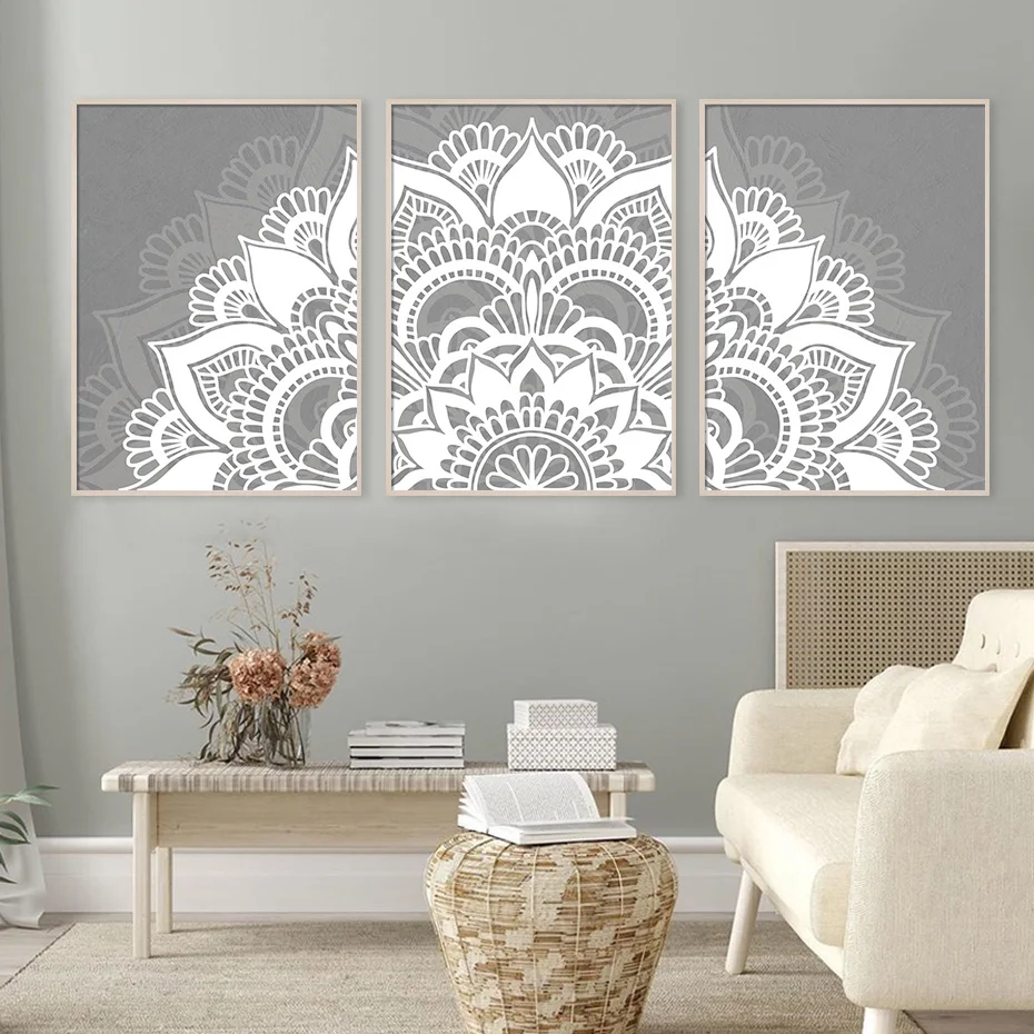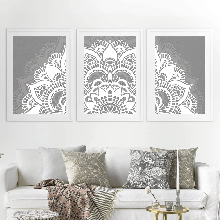 Серая богемная Настенная картина, подарок, мандала, принты, Абстрактный Цветочный узор, холст, постер, белая картина для йоги, декор для домашней комнаты