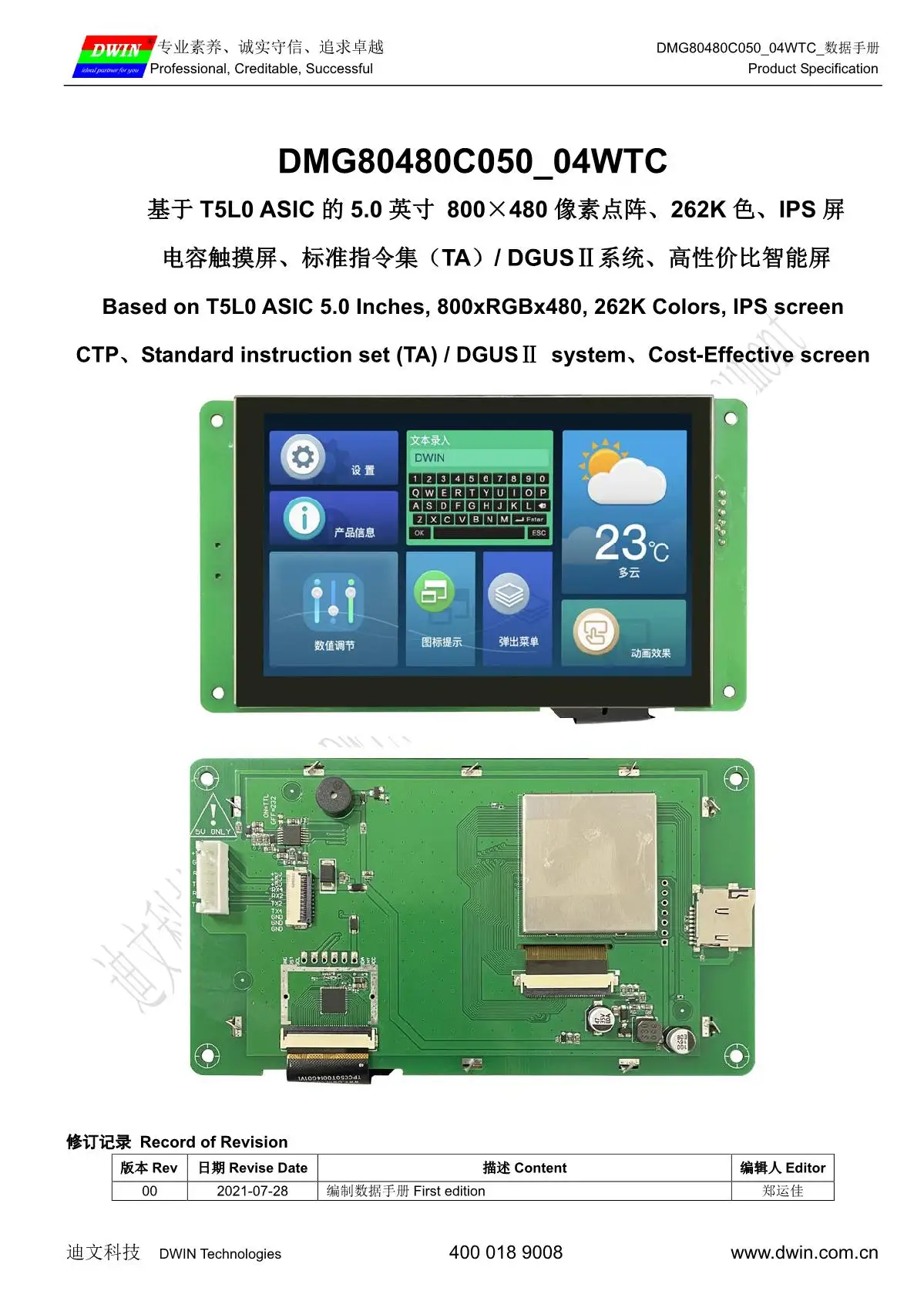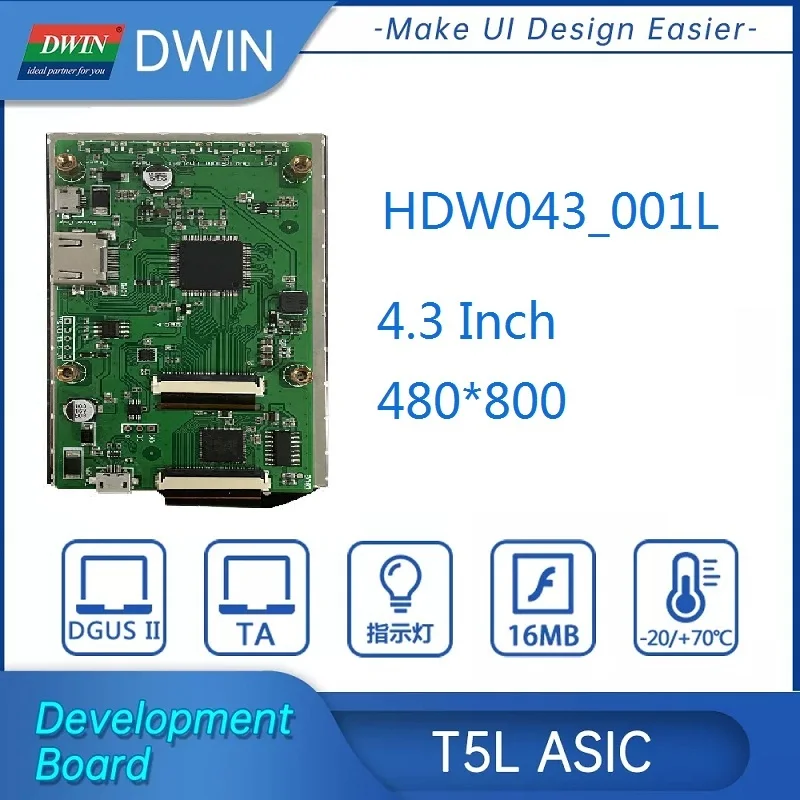 DWIN 5,0 дюймов 800x48 0 разрешение, 262K цвет, IPS экран, коммерческий высокий стандарт TFT ЖК-модуль Дисплей HMI резистивная сенсорная панель. DMG80480C050_04WTC-это интеллектуальный сенсорный экран с портом UART, который может управляться любым MCU с помощью команды, Таким образом, он может использоваться в качестве TFT дисплея и сенсорного контроллера в различном электронном оборудовании. Панель ЖК-дисплея, сенсорный ЖК-экран, дисплей DWIN-ваш лучший выбор для проекта HMI. DMG80480C050 _ 04WTC ЖК-дисплей на основе процессора DWIN T5L с двухъядерным графическим интерфейсом и ОС. Ядро GUI может поддерживать дизайн интерфейса на основе мощного программного обеспечения DWIN design, включая данные, текст, кривые, базовую графику, загрузку ключа, И т. Д. Ядро ОС можно открыть клиенту для второй разработки в сборке ОС, и это улучшает функциональность графического интерфейса. Все MCUs могут подключаться к интеллектуальному дисплею DWIN.