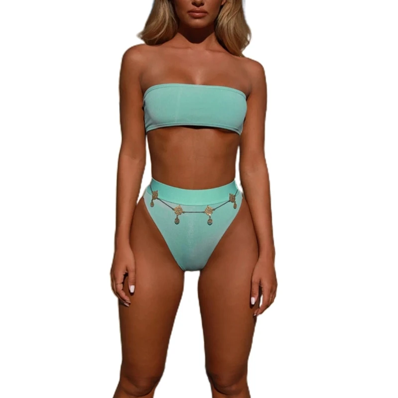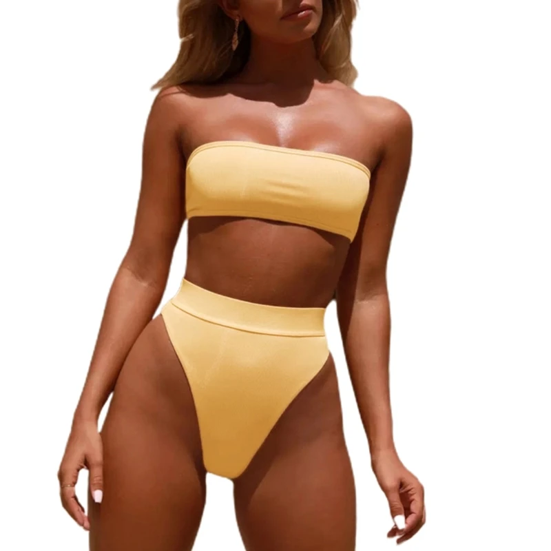 Женский сексуальный комплект бикини из 2 предметов, купальник-бандо без бретелек со съемными вставками, стринги с высокой талией, однотонный купальный костюм, быстрая доставка