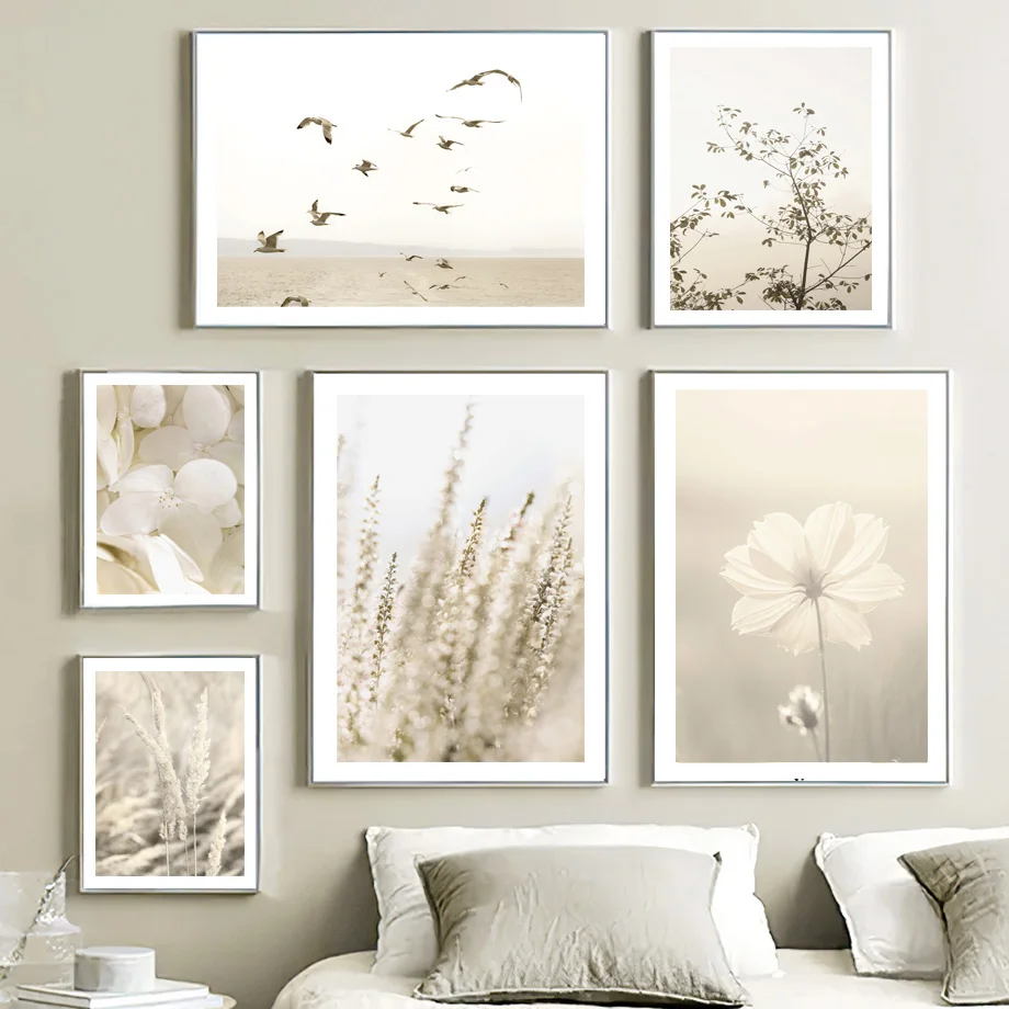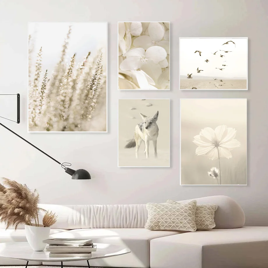 Картина на холсте, бежевая Маргаритка, рисунок с тростником, шалфеем, пустыней, лисой, постеры в скандинавском стиле, настенные картины для декора гостиной