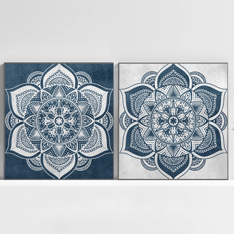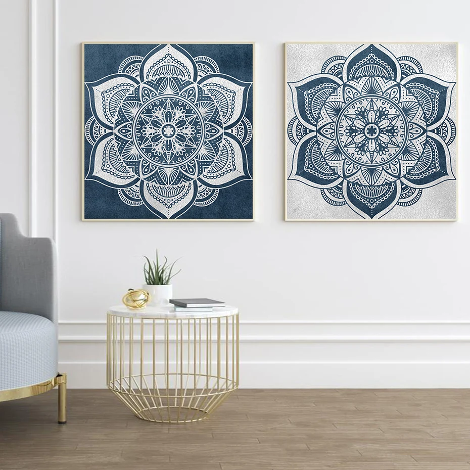 Сине-серая мандала, холст, постер, цветочный узор в стиле бохо, Zen...