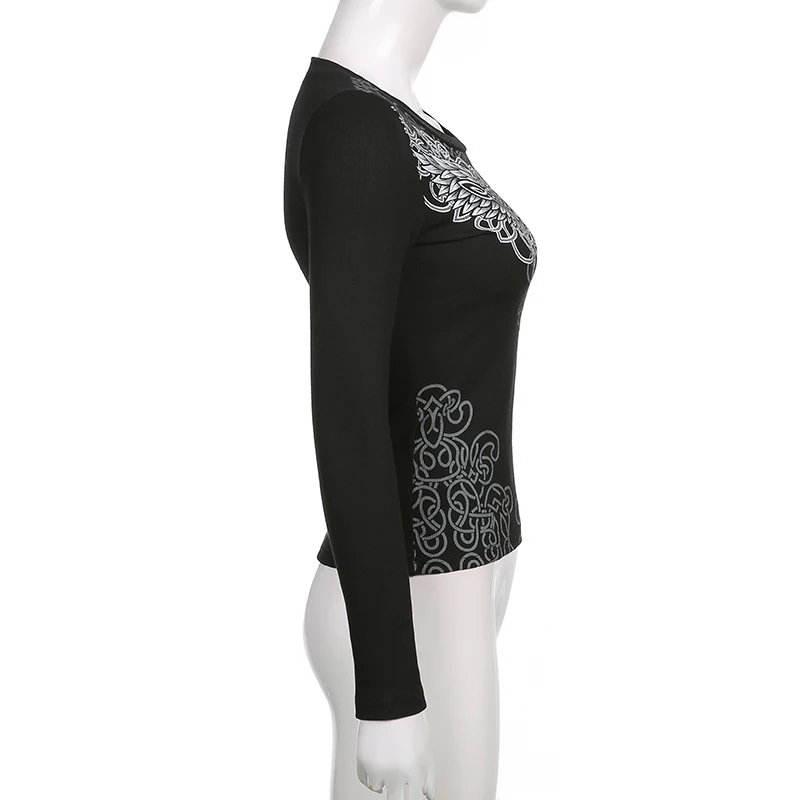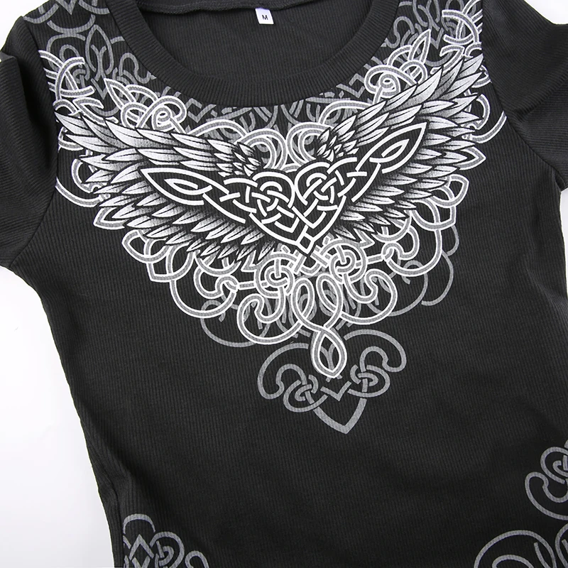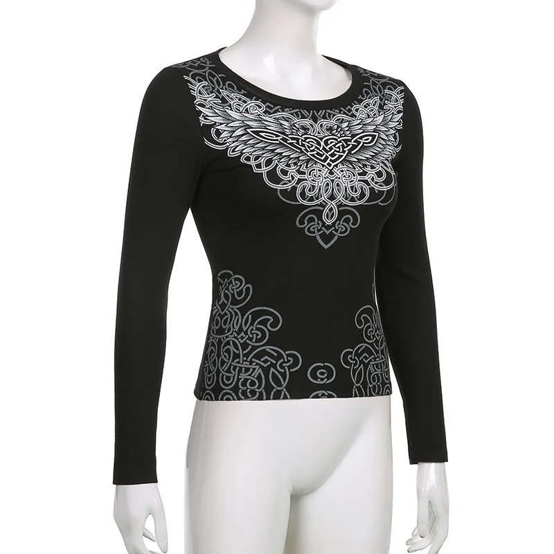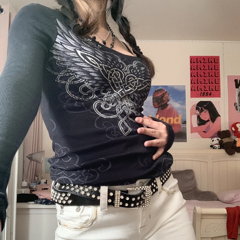 Осенняя черная футболка с винтажным принтом для E-girl в стиле Хара...