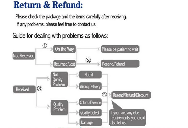 Хотя мы уверены в качестве и цене наших продуктов, мы не можем гарантировать, что любой покупатель будет на 100% доволен ими. Тем не менее, мы гарантируем, что мы постараемся сделать все возможное, чтобы решить любые проблемы, которые возникают во время сделки. Для меня Честность всегда показывает нашу ценность. Если вы просите вернуть деньги из-за дефекта или другой проблемы с качеством товара, пожалуйста, свяжитесь с нами в течение 3 дней после получения товара. Стоимость передачи посылки должны быть оплачены вами.