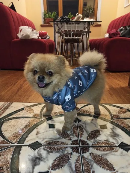Товар пришел за 3 недели. Качество хорошее, материал приятный, всё как на картинке. На щенка мальтийской болонки 960 грамм по весу и 19 см в холке - размер S великоват, но мы брали на вырост.