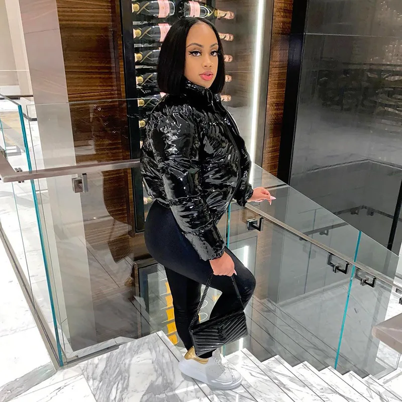 Модная Милая женская Яркая розовая пуховая куртка из искусственной кожи зимние теплые пузырьки блестящие кожаные парки пуховые укороченные куртки на молнии парки