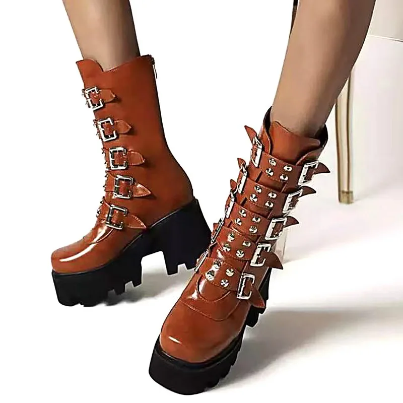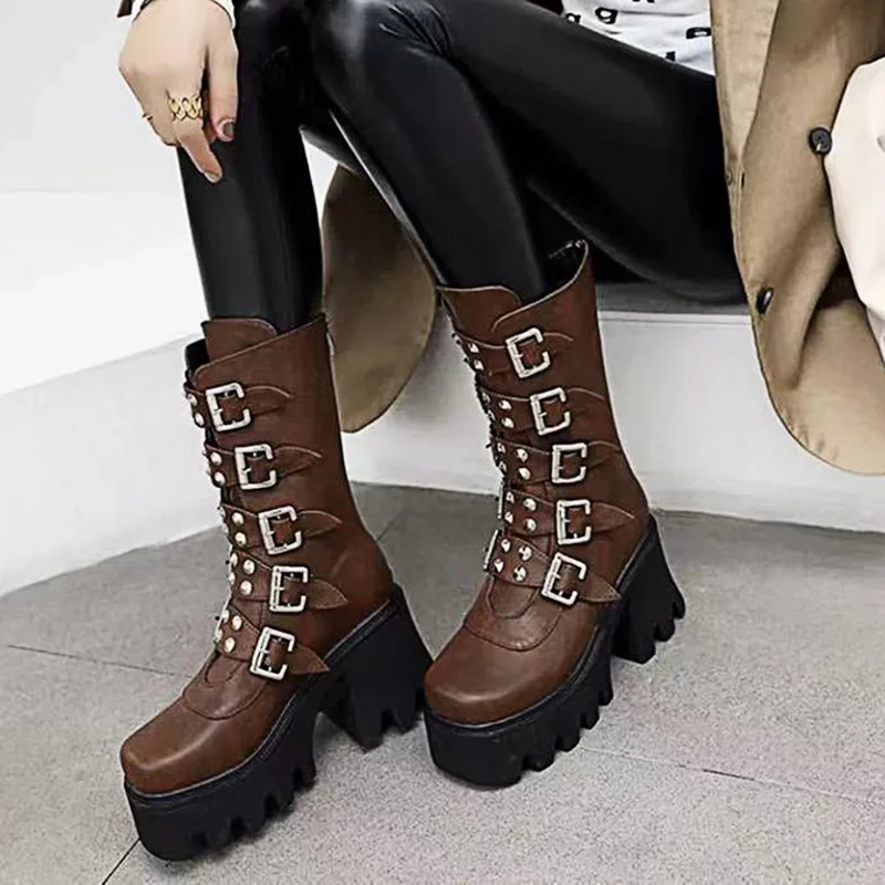 Женские ботинки на платформе в готическом стиле, черные боевые ботинки до середины икры, на молнии, с пряжкой, на танкетке, в стиле милитари, для зимы