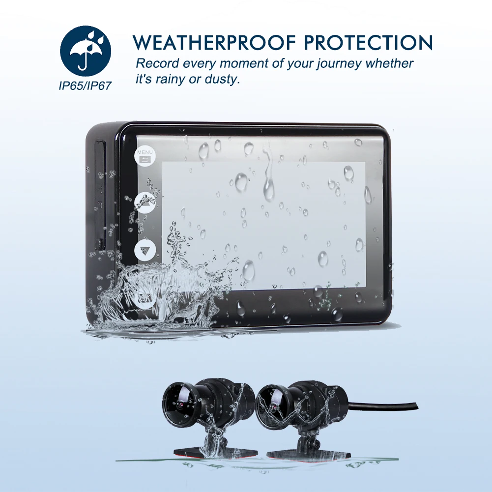 IP67 водонепроницаемый дизайн для камер; IP65 водонепроницаемый дизайн для основного блока и других аксессуаров; И Специальная водонепроницаемая коробка защитит основной корпус в дождливый день. Будь то дождливая или пыльная, она работает стабильно, записывая каждый момент вашего путешествия.● Пожалуйста, не смывайте основной блок, линзы, модуль питания, проводной контроллер и gps-трекер с помощью водяного пистолета высокого давления.