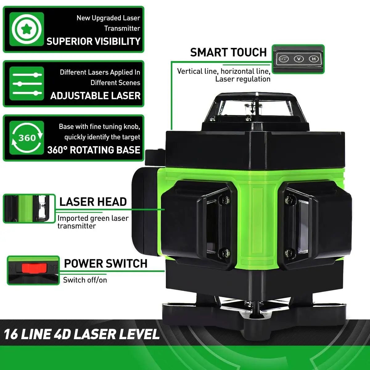 Лазерный уровень, 16 линий, лазерный уровень с зеленым лучом и зеленым лучом, 360 градусов, горизонтальный и вертикальный Сверхмощный лазерный уровень