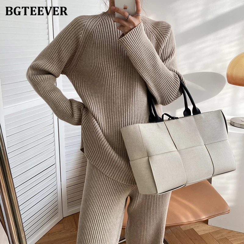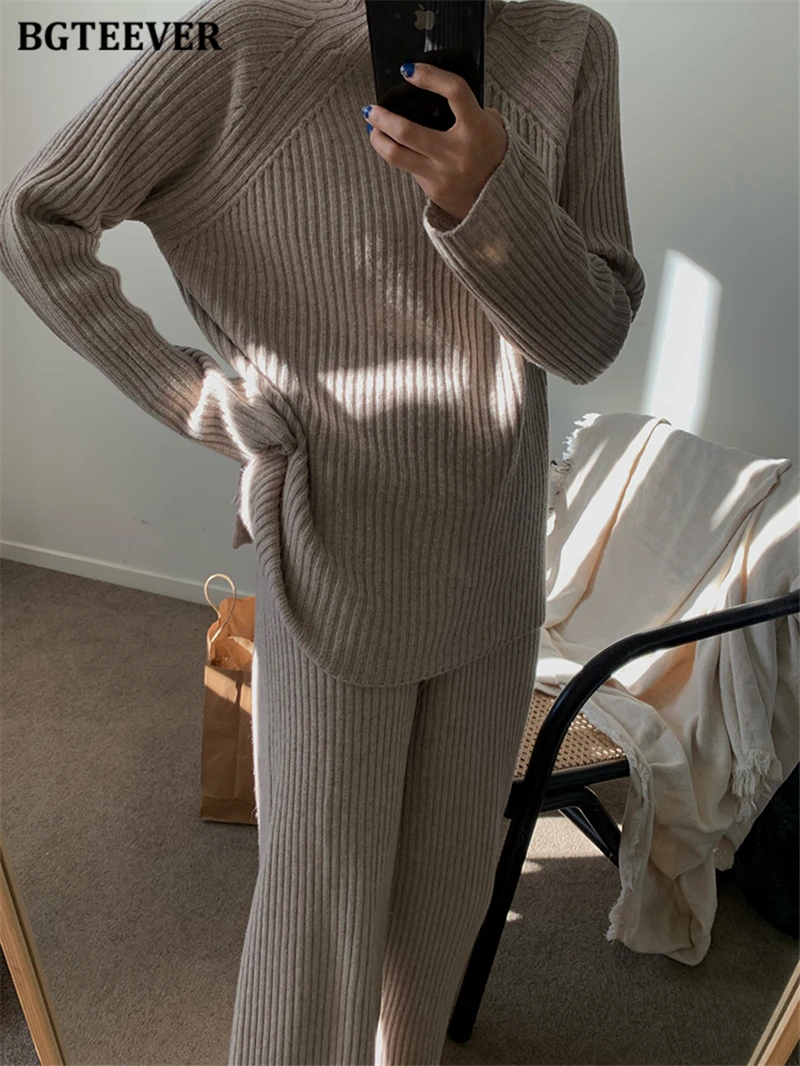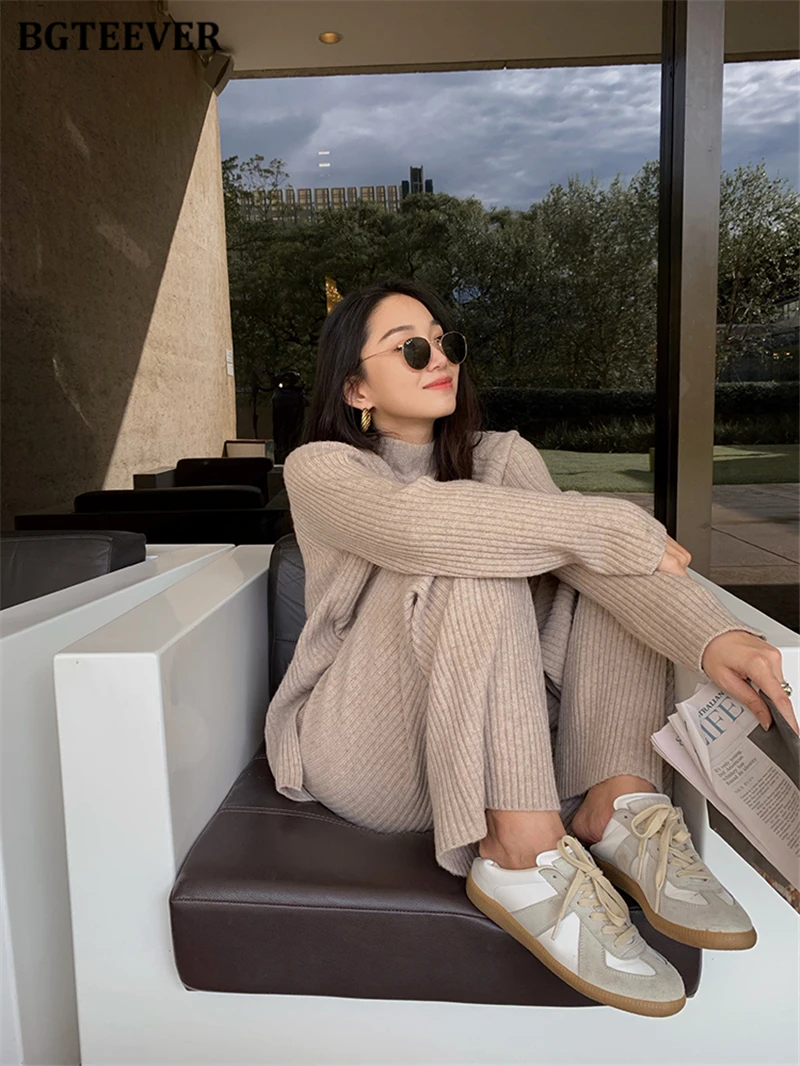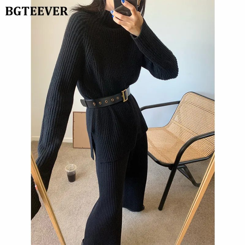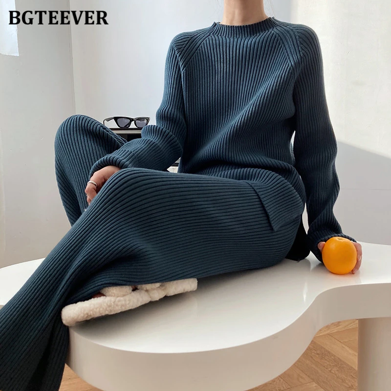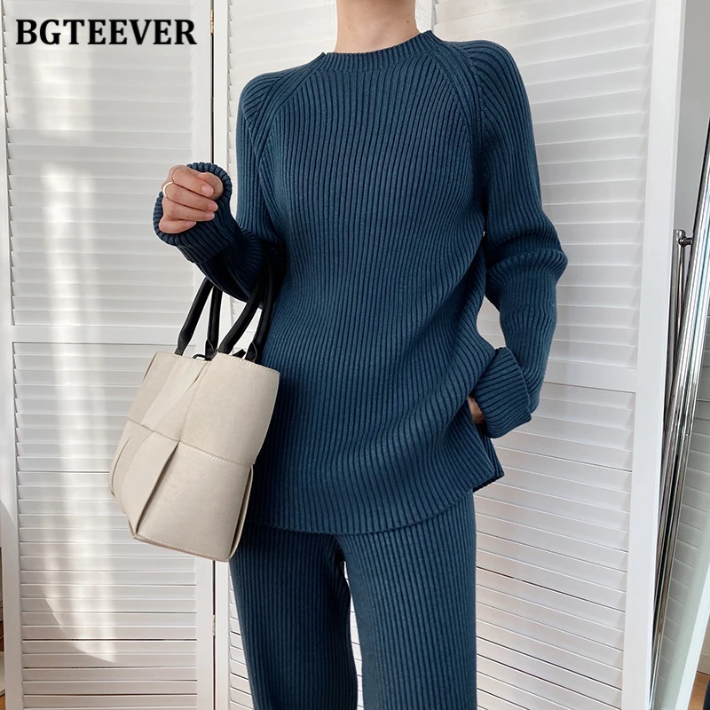 Женский трикотажный комплект BGTEEVER, однотонный пуловер с длинным рукавом и брюки с эластичным поясом, осень 2021, набор свитеров