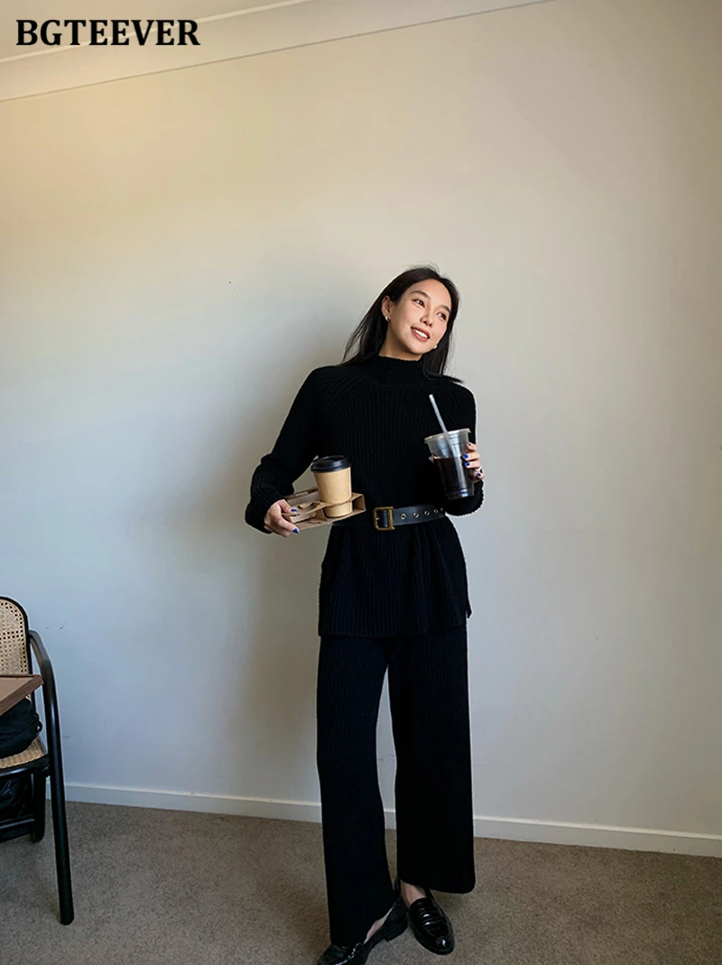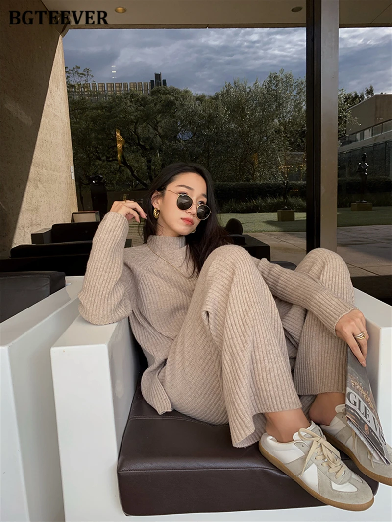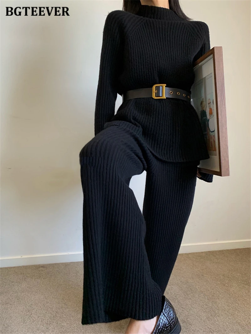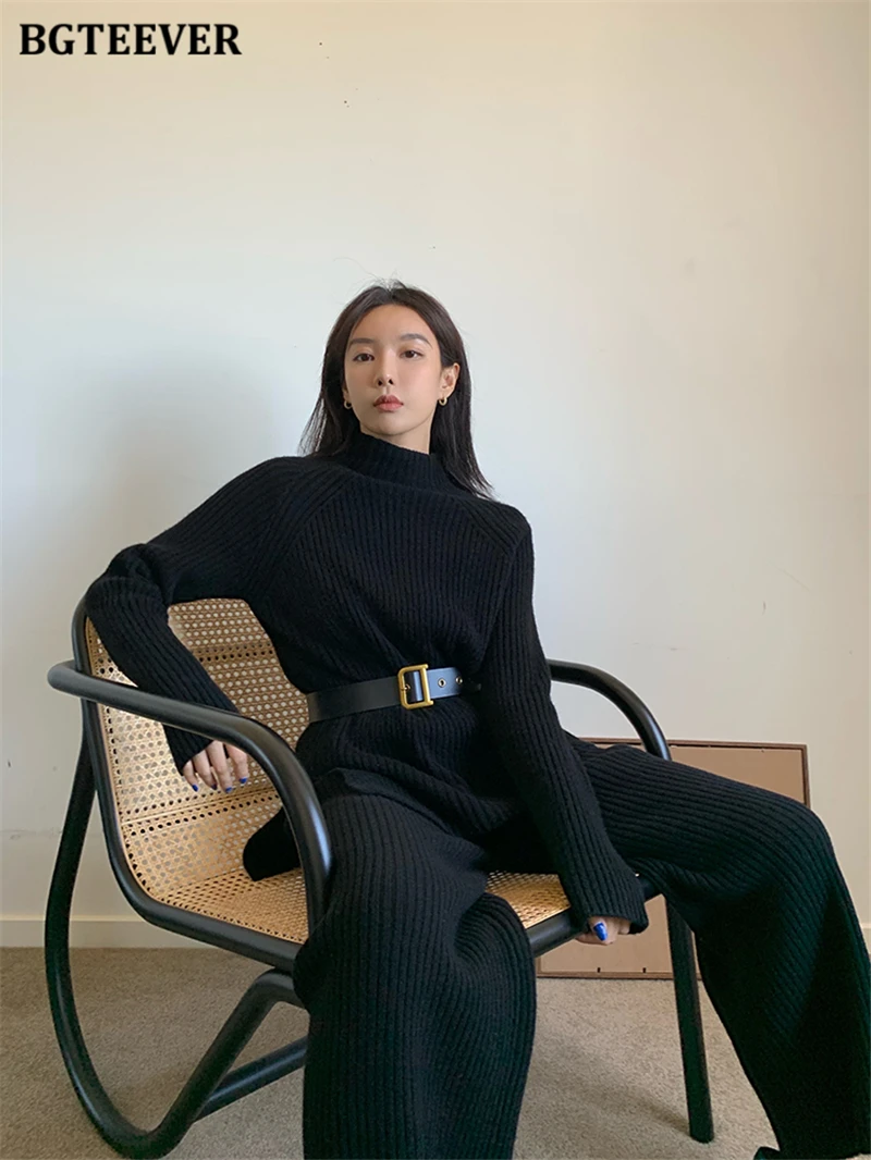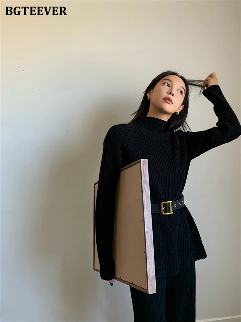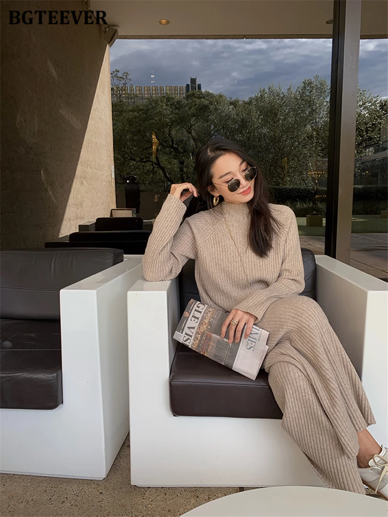 Женский трикотажный комплект BGTEEVER, однотонный пуловер с длинным рукавом и брюки с эластичным поясом, осень 2021, набор свитеров
