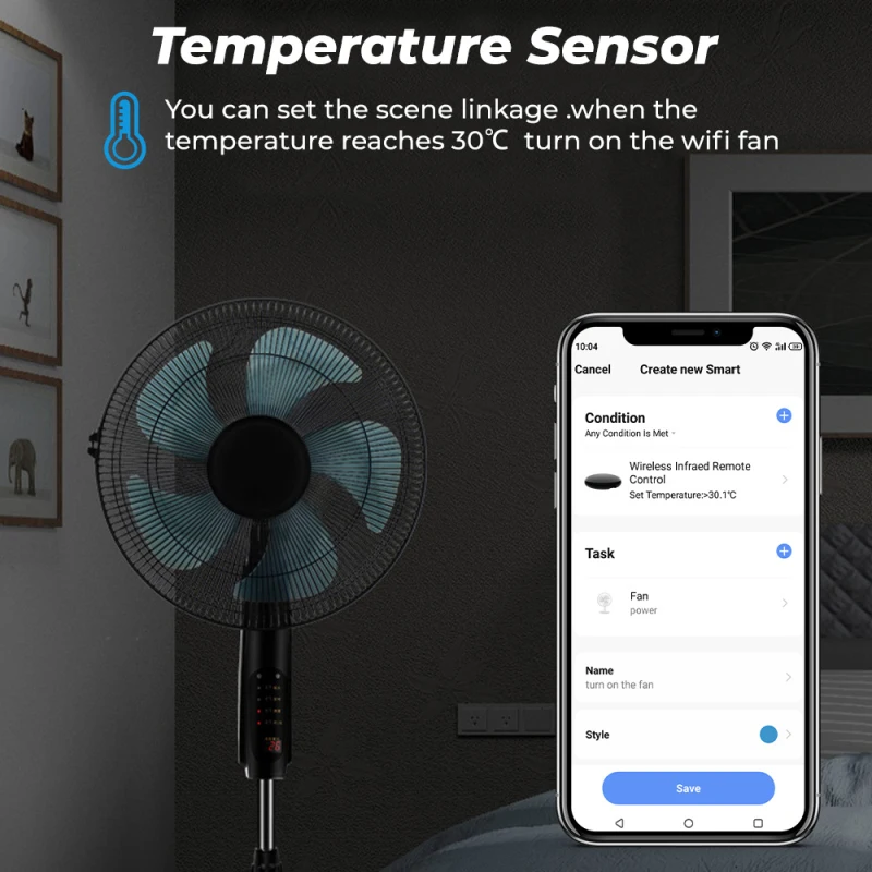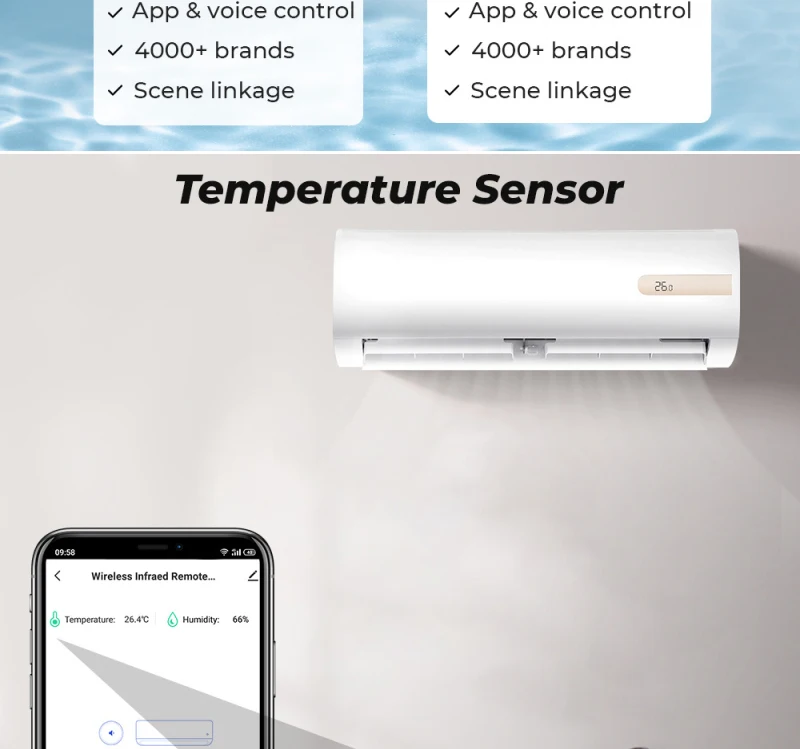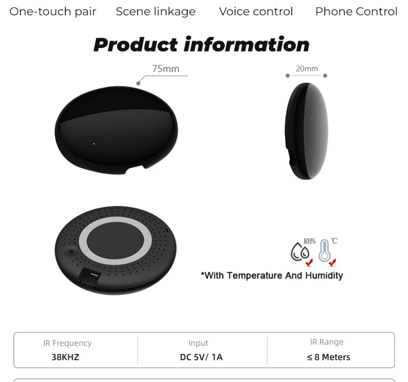 【APP пульт дистанционного управленияВы можете управлять инфракрасным устройством через Бесплатное мобильное приложение Smart Life/TUYA в любое время и в любом месте, а также проверять температуру и влажность в помещении.