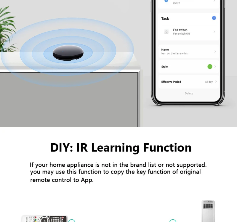 2. Пользовательская функция «сделай сам»: если вы не можете найти бренд устройства в приложении «Smart Life», программируемая функция «сделай сам» может помочь скопировать ту же функцию с оригинального пульта дистанционного управления. Большинство ИК-устройств дистанционного управления подходят, такие как очистители воздуха, нагреватели, вентиляторы, кондиционеры, dvd-диски, телевизоры.