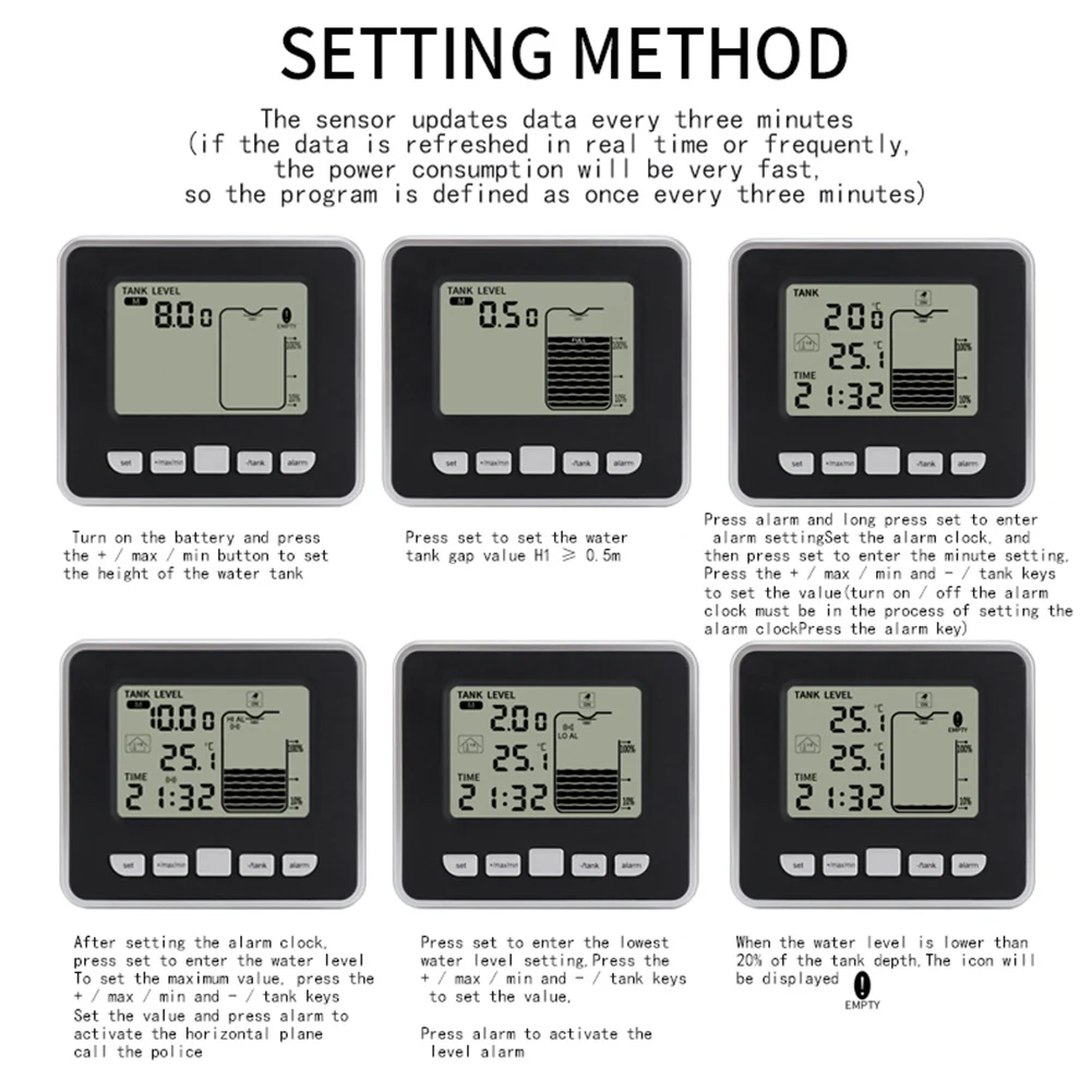 Ультразвуковой измеритель уровня жидкости в резервуаре с датчиком температуры и индикацией времени, сигнализацией, приемником и приемником для измерения глубины жидкостиХарактеристика:1. Прибор контролирует уровень жидкости в баке, который отображается на ЖК-дисплее 10 элементов.2. Он может записывать минимальную/максимальную запись уровня бака. Поддерживает высокий/Низкий уровень жидкости в баке и пустой резервуар сигнализации.3. Внутренняя температура (°F или ° C) и температура коробки (°F или ° C) отображаются одновременно. Приемник может стоять на столе или висеть на стене.Спецификация:Материал: АБС-пластикДиапазон температуры в помещении: 0-60 ° CДиапазон температуры в помещении: 0-60 ° CТочность температуры: ± 1 ℃Диапазон измерения уровня воды: 0 ~ 15 мУвеличение: 0,01 мТочность: + / -0,03 мЧастота передачи: 433 МГцДальность передачи: 100 м на открытой местностиИнтервал передачи: 30 секунд, когда уровень меняется, или 3 минуты, когда уровень остается неизменным.Аккумуляторы приемника: 2 батарейки АА (не входят в комплект).Батарейки для передатчика: 6 батарей AAA (не входят в комплект).Срок службы аккумулятора: не менее 12 месяцев для приемника.Передатчик должен использоваться не менее 12 месяцев.Размер посылка: 165x110x105 мм/6.49x4.33x4.13''Размер ЖК-дисплея: 66x45 мм/2.59x1.77''Тип жидкости: все некоррозионные жидкостиПримечание:Возможны отклонения в 1-3 мм вследствие измерений вручную.Из-за различных дисплеев и различного светильник, изображение может не показать фактический цвет товара. Спасибо за понимание.