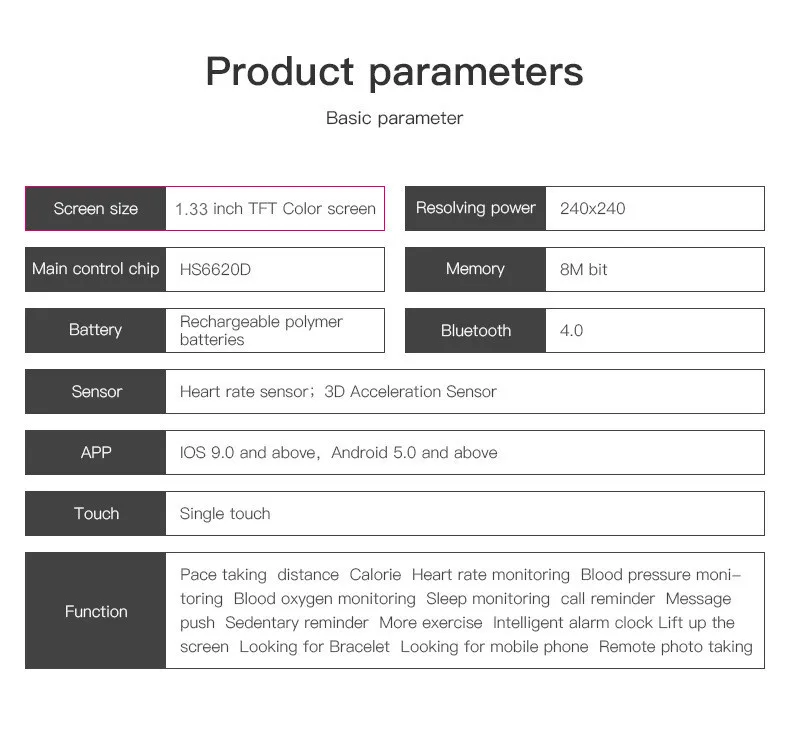 Функции программного обеспечения: отображение времени, спортивный режим, экран с приподнятой рукой, мониторинг сна, трек для бега, напоминание о звонках, напоминание о сообщениях, напоминание о сидячем положении, напоминание о тревоге, режим «Не беспокоить», встряхните фотографию, поиск браслета, переключатель циферблата, китайский и английский циферблат, ежечасное измерение, кампания WeChat, частота сердечных сокращений, Кровяное давление, кислород в крови, apple health, health week, название Bluetooth, язык