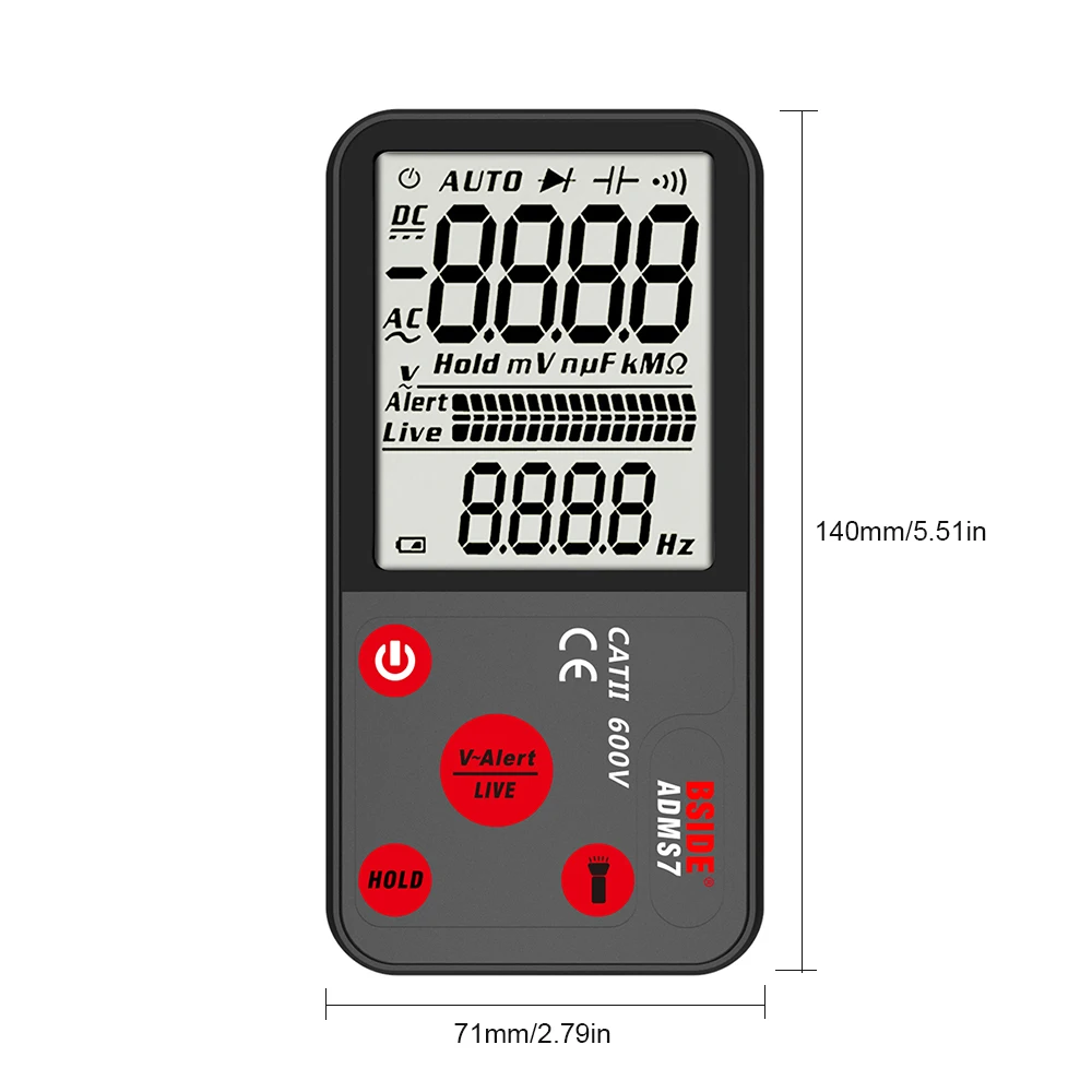 Особенности: Возможность Тестирования прямого тока/напряжения переменного тока, сопротивления, частоты, непрерывности, емкости, диодов и обеспечивает Обнаружение NCV и идентификацию провода в режиме реального времени. Оснащен 3,5-дюймовый большой экран, который показывает 9999 отсчетов четкие показания, легко читаемый. Ультратонкий дизайн, просто размер мобильного телефона, что делает его чрезвычайно портативным и легко носить с собой. Встроенный фонарик позволяет удобно использовать в ночное время или в темном уголке. Практические функции, включая автоматическое измерение диапазона, защиту от перегрузки и автоматическое отключение питания в течение 3 минут, если нет работы. Полезный инструмент для установки домашней цепи, ремонта электроники, обслуживания электрических объектов, ремонта автомобилей, ремонта бытовой техники. Характеристики: Бренд: BSIDE Модель: ADMS7 / ADMS9 (опционально) Материал: АБС-пластик Мощность питания: 2 х кнопочная ячейка CR2032 3V (не входит в комплект) Модель (опционально) ADMS7 ADMS9 Напряжение прямого тока 600V/0,1 V ±(1.2% + 5) Напряжение переменного тока 600V/0,1 V ±(0.8% + 3) Сопротивление 6000Ω/1Ω ±(1.2% + 3) 10 м Ом/1 Ом ±(1.2% + 3) Частота 1000 Гц/1 Гц ±(2.0% + 10) Емкость N/A 1000 мкФ/0,1 мкФ ±(3.5% + 8) 6000 мкФ/0,1 мкФ ±(4.5% + 10) Диод N/A Да Непрерывность При звуке встроенного зуммера измеренное сопротивление составляет не более 30 Ом Обнаружение NCV Да Хранение данных Да N/A Экран дисплея HD ЖК-дисплей экран (3,5 дюйма) Счетчик дисплея 6000 штук 9999 подсчетов Размер изделия: 140*71*15,5 мм/5,51*2,79 * 0.61in Вес изделия: 110 г/3,88 унций Вес посылка: 186 г/6,56 унций Размер посылка: 16,3*7,3*3,7 см/6,41*2,87 * 1.45in Упаковочный лист: 1 * Цифровой мультиметр 1 * пара тестовых проводов 1 * Руководство пользователя (на английском языке)