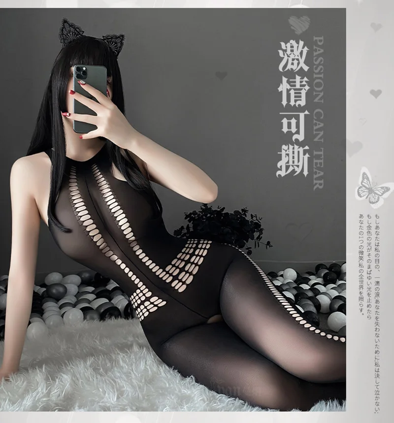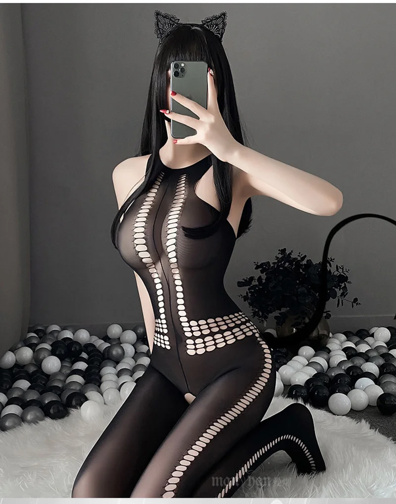Женский черный сексуальный прозрачный облегающий костюм-кошка, эрот...