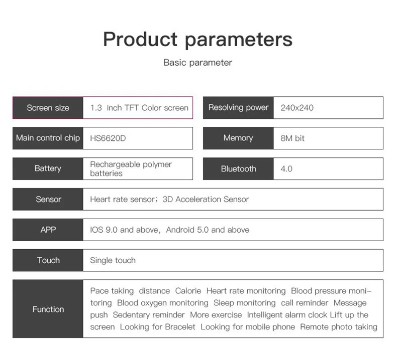 Советы:1. Этот продукт может быть только водонепроницаемым (прохладная вода), пожалуйста, не носите его, чтобы плавать, уроните его в воду или пропитанный водой и т. Д.2. Если часы не могут быть тронуты посередине, пожалуйста, слегка коснитесь экрана слева, эффект будет лучше.Обратите внимание:1. Носимые устройства отслеживают деятельность человека с помощью электронных датчиков, и они находятся на потребительском уровне. Это нормально для определенных отклонений. Пользователь должен рассматривать данные объективно.2. Пожалуйста, не сравнивайте с больничным оборудованием для чтения, это не медицинское устройство!3. Перед использованием отсканируйте qr-код в руководстве, чтобы загрузить приложение и подключить его к часам с помощью приложения.4. Для пользователя Android: пожалуйста, всегда разрешайте доступ приложения ко всем функциям телефона и Всегда позволяйте ему работать. И, пожалуйста, включите GPS на вашем телефоне, прежде чем подключить его.5. Пожалуйста, заряжайте его в течение 2-3 часов при получении. После длительной доставки у него не было электричества. Спасибо!Функция:Трекер сердечного ритмаАртериальное давлениеКислород в кровиШагомерСпортивный Модер: шаги, склеивание, сидениеТрекер снаКалорииPush-сообщениеНапоминание о звонкеБудильникЗащита от потериПульт дистанционного управленияУведомления в социальных сетяхНапоминание о сообщенииЯзык приложения: корейский, русский, испанский, английский, немецкий, итальянский, японский, французский, китайскийЯзык часов: английскийСпецификация:Стиль: спортивныйМатериал корпуса: пластикТип экрана: 1,3 дюймов TFT 240*240Съемный ремешок: ДаСенсорный экран: ДаСовместимость: все совместимыBlutooth: 4,0Bettery: 90 мАчВремя работы в режиме ожидания: около 7-10 днейВремя работы: около 3-5 днейСистема: IOS 9,0 и Android 5,0 вышеПосылка включает:1 * умные часы (без зарядного устройства в коробке)1 * Руководство пользователя1 * Розничная коробка1. Возможна разница в 1-2 см в соответствии с измерениями вручную. Пожалуйста, внимательно проверьте размер перед покупкой товара.2. Пожалуйста, обратите внимание на то, что размеры s светильник разница в цвете, это может быть связано с положением источника светильник и с настройками экрана.3. После длительной транспортировки некоторые предметы могут быть повреждены. Если он был сломан, пожалуйста, свяжитесь с нами, мы предложим вам удовлетворенный ответ.