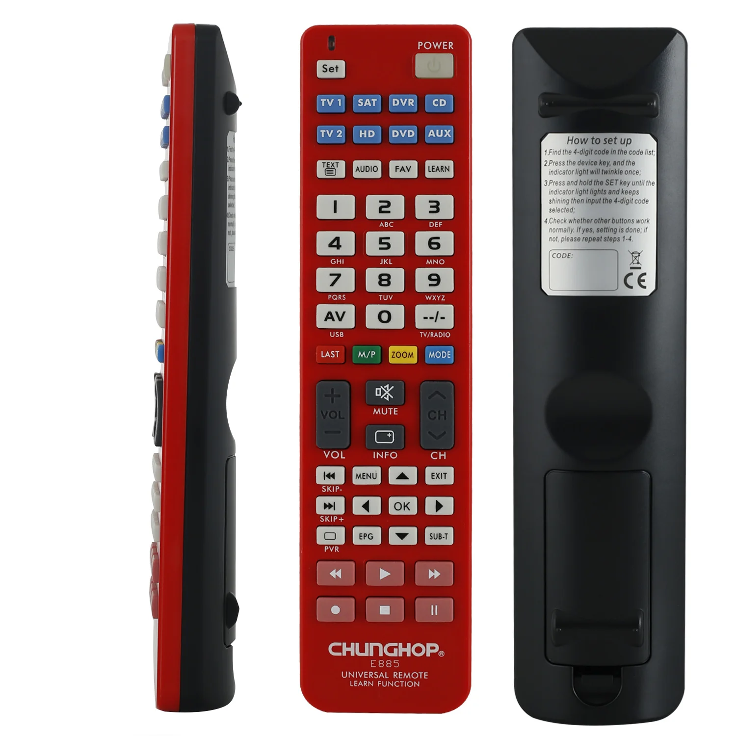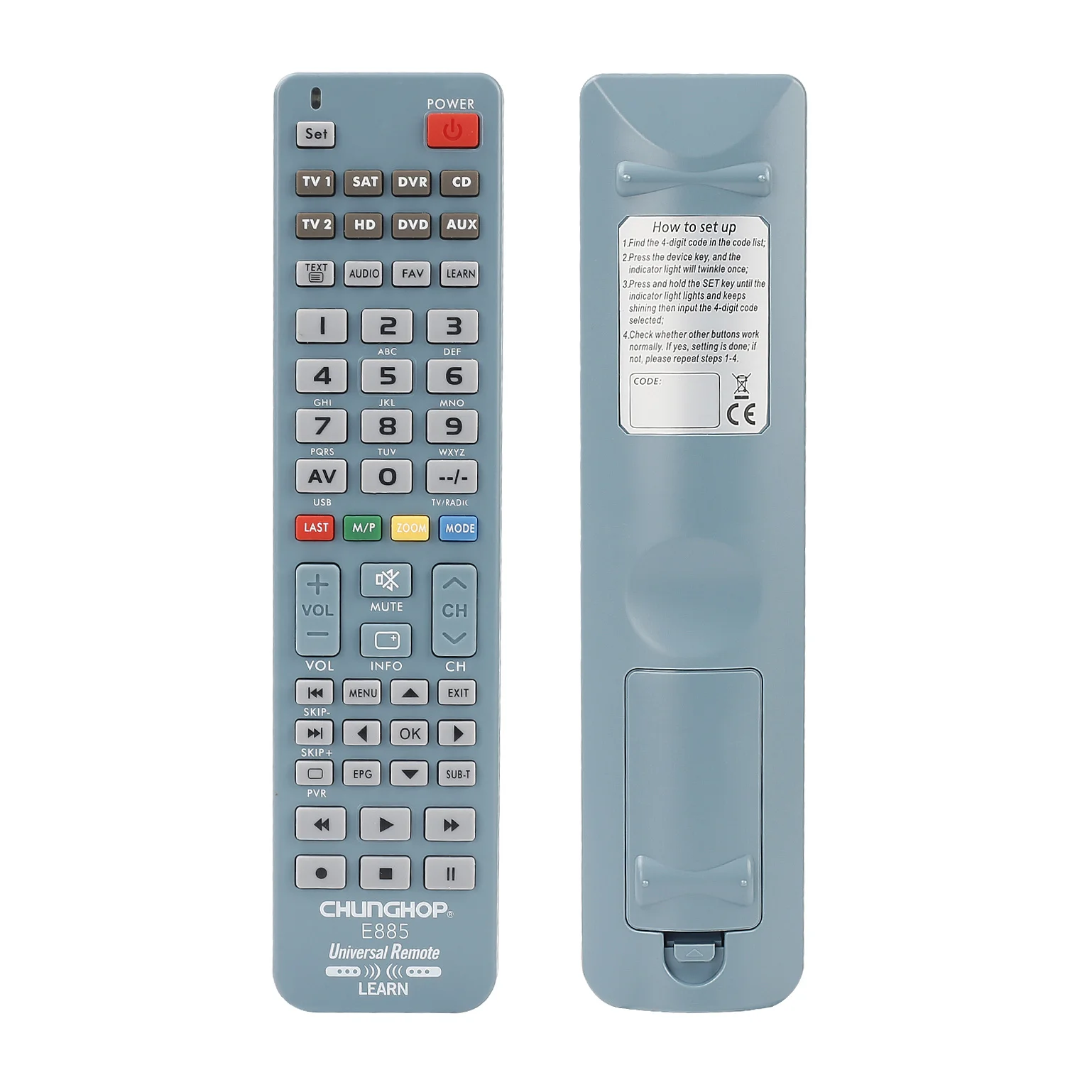E885 методы обучения:1. Сначала нажмите соответствующую клавишу устройства, которую вы хотите узнать (например, телевизор), а затем индикатор будет мигать один раз;2. Нажмите и удерживайте кнопку настройки «set» до тех пор, пока светильник индикатора не будет всегда включен;3. Затем нажмите клавишу обучения «learn» (или этот шаг может быть заменен на ввод «9980»), и индикатор будет мигать один раз;4. Разместите свой оригинальный пульт дистанционного управления (пульт дистанционного управления) Лицом к e885 около 2-5 см, нажмите клавишу, которую вы хотите узнать на e885 (например, номер «1») (За исключением восьми клавиш устройства, ключей и обучающих клавиш, другие можно узнать), А затем нажмите соответствующую клавишу на вашем оригинальном пульте дистанционного управления (например, клавишу «1»);5. После изучения других клавиш, которые вы хотите узнать в свою очередь, нажмите кнопку настройки «set», чтобы выйти из режима обучения.
