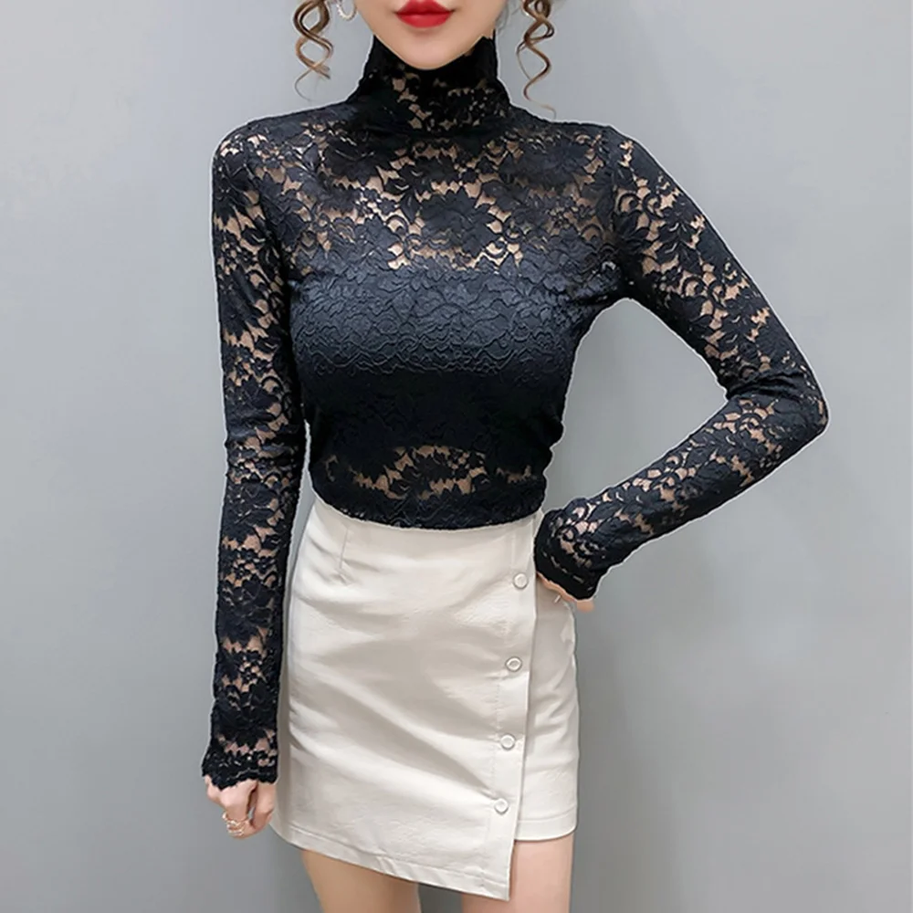 Осенняя Женская тонкая черная кружевная футболка, привлекательная Водолазка с длинным рукавом, тонкая кружевная вязаная крючком Футболка в стиле пэчворк, топы, Сексуальное белье