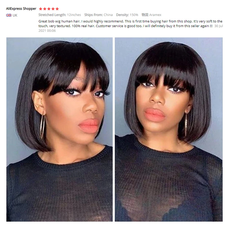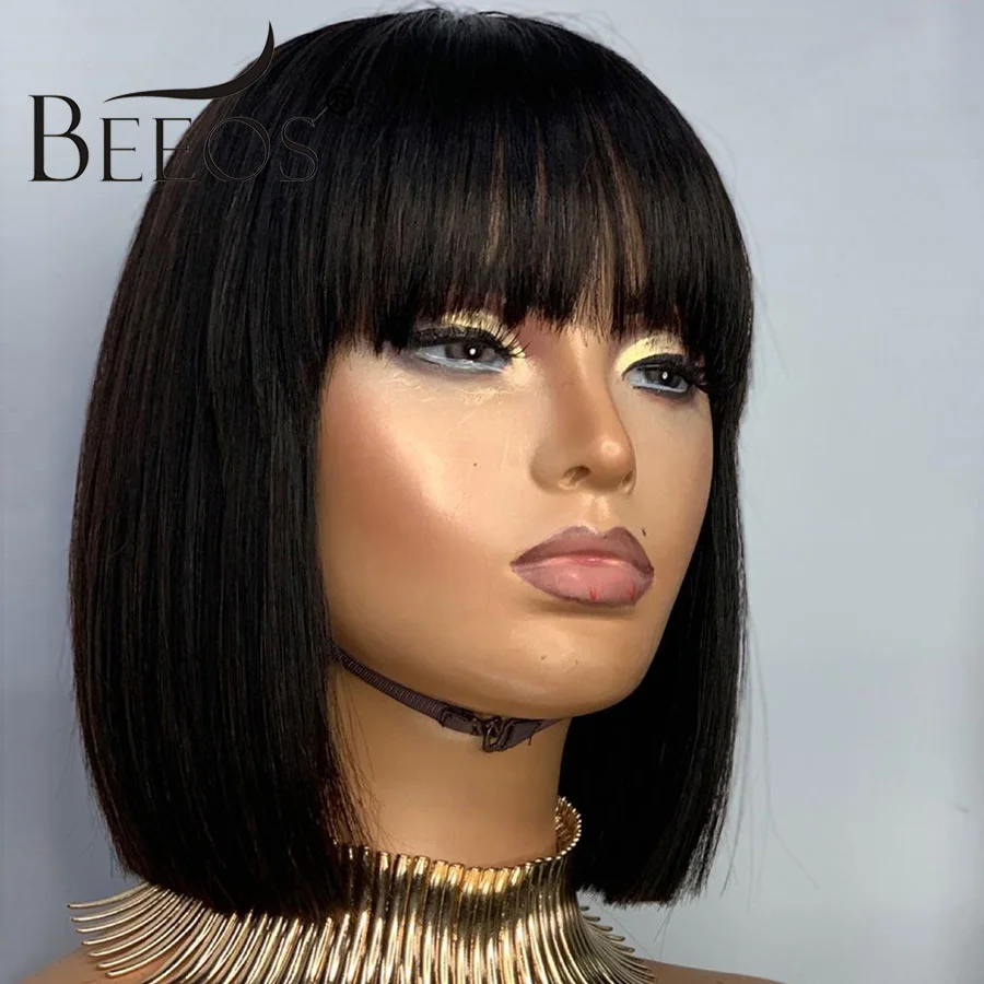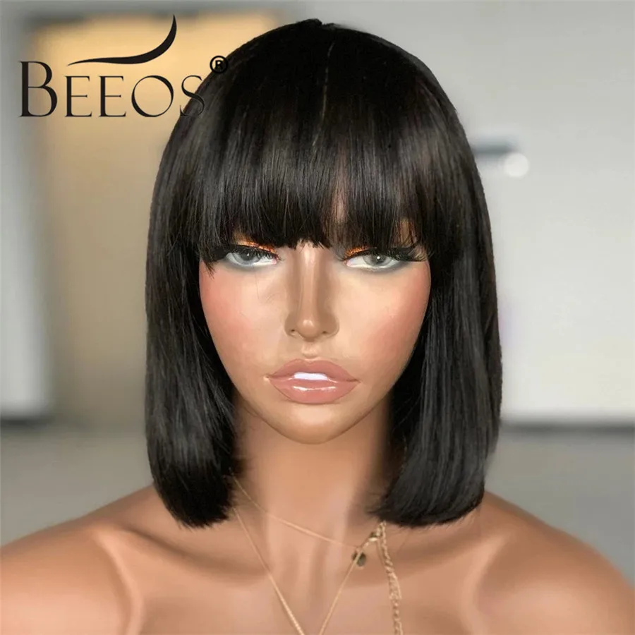 Beeos Короткий прямой парик Боб с челкой, бахромой, парик из человеческих волос, полностью машинный, сделанный для чернокожих женщин, бразильские волосы Remy без клея