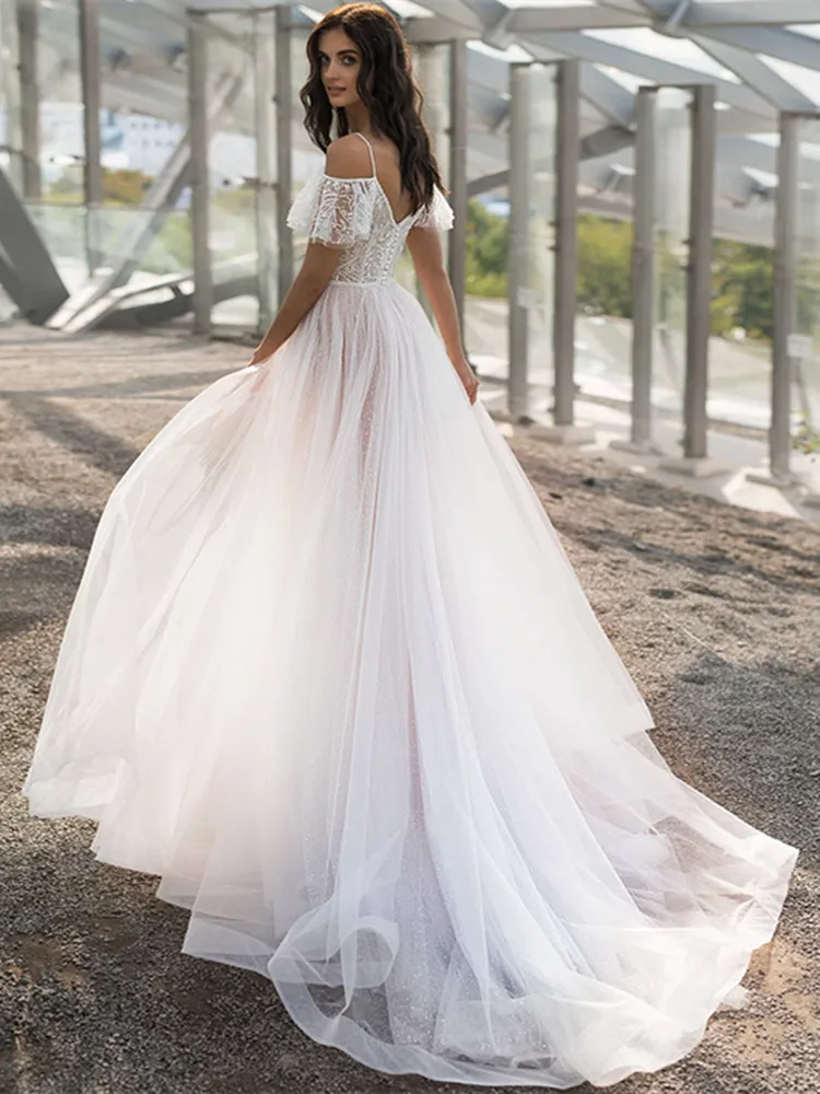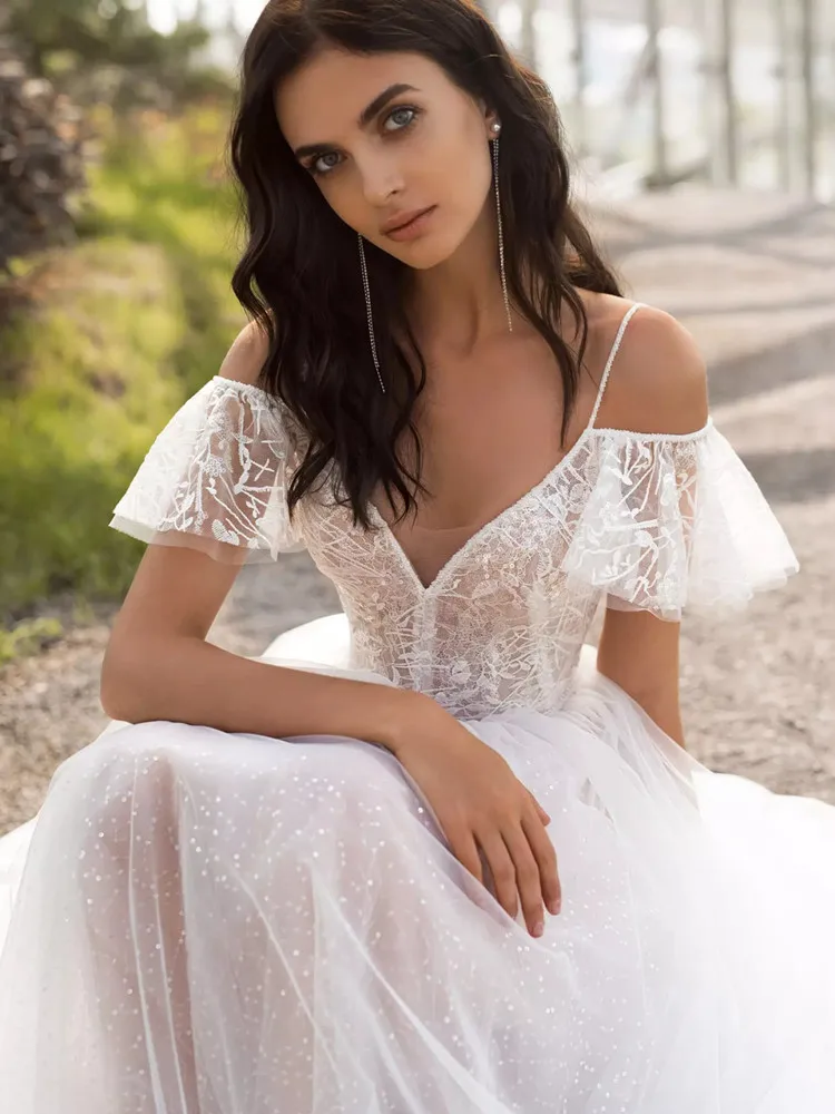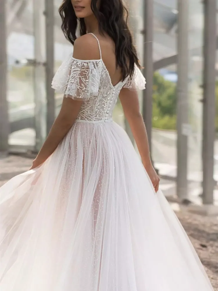 Свадебное платье из органзы с V-образным вырезом, рукавами-крылышками и пуговицами на бретельках, длинное свадебное платье со шлейфом, 2021