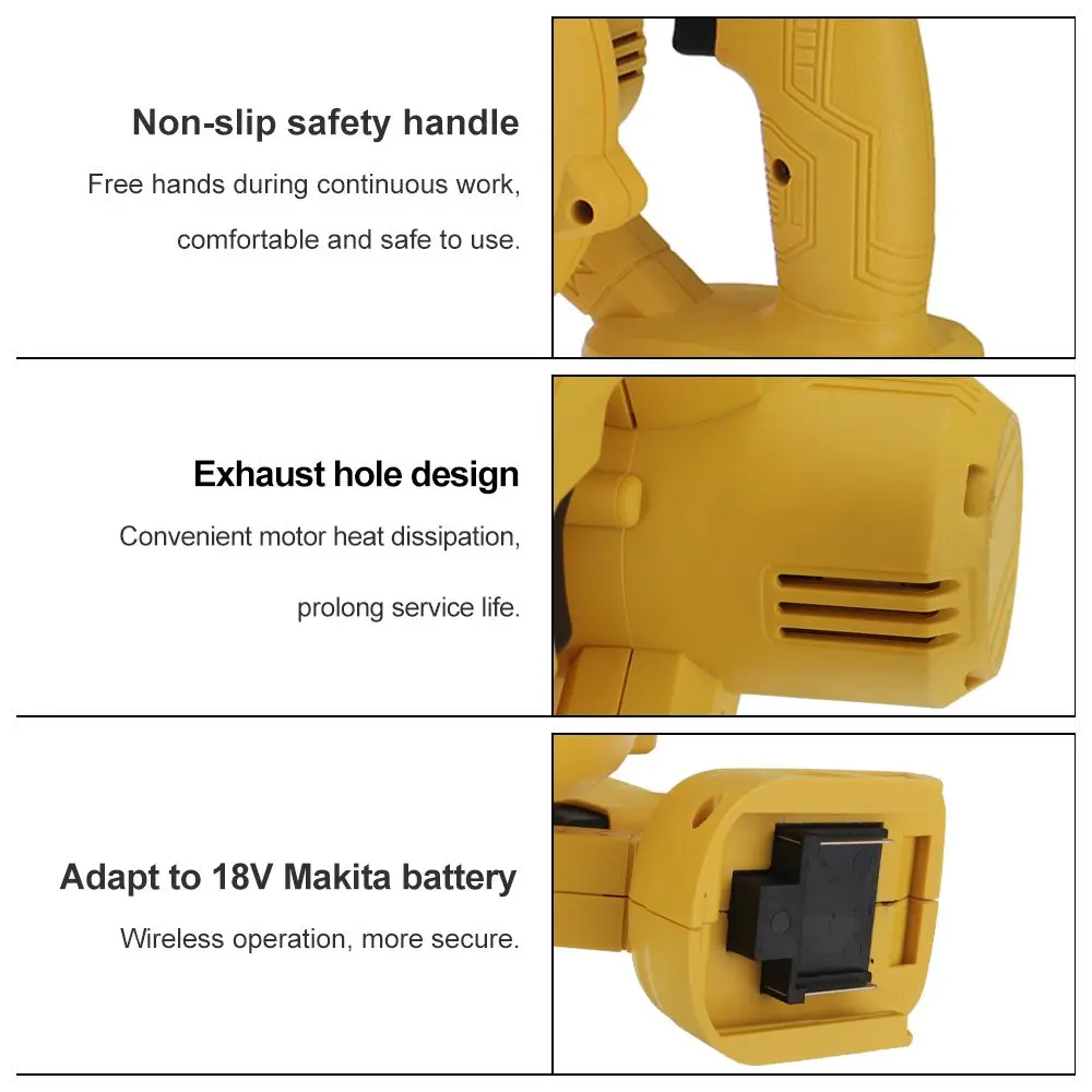 Использование:-Очистка сельскохозяйственной техники, деревообрабатывающих машин, сбора пыли в рабочих местах, выдувания капель воды после очистки и сушки.-Очистите от пыли Материнские платы, чехол компьютера и источник питания. Легко очищает пыль/волосы от постельных принадлежностей, углов, днища кровати, Ковров, мебели и т. Д.