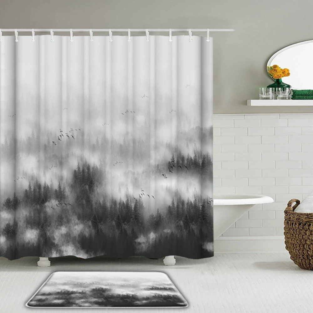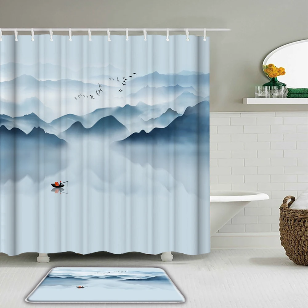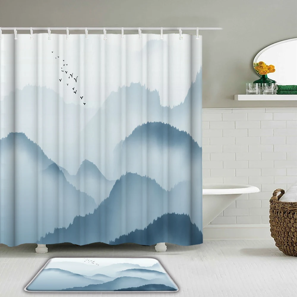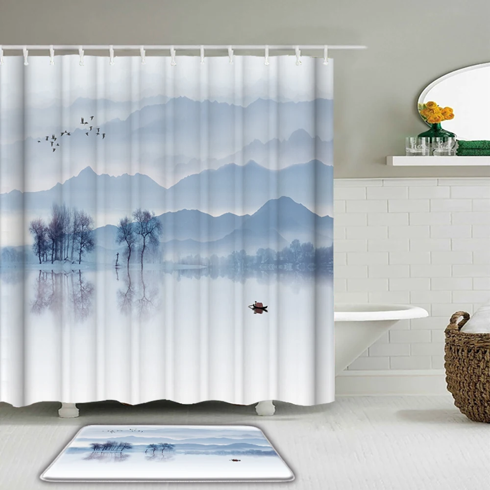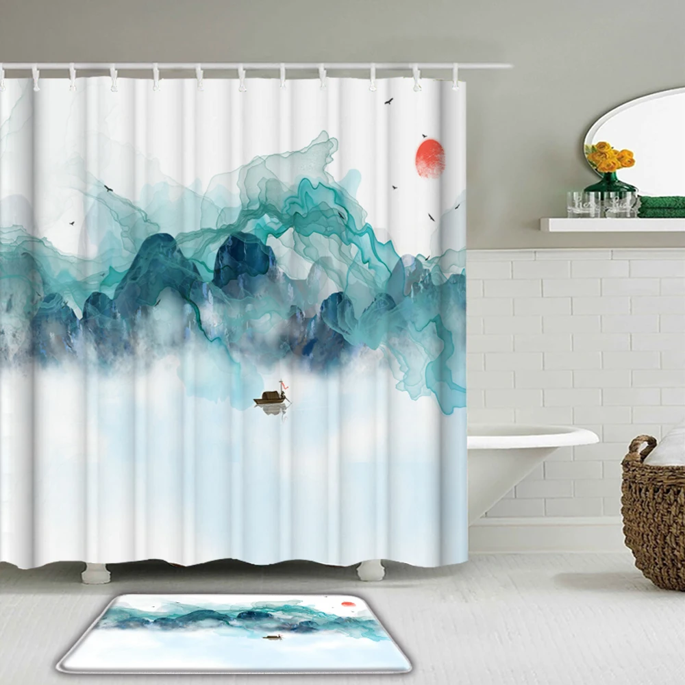 Занавески для душа, 2 шт.компл., с 3d-рисунком тушью, с пейзажем, водонепроницаемые, с нескользящим ковриком для ванной, коврики для туалета