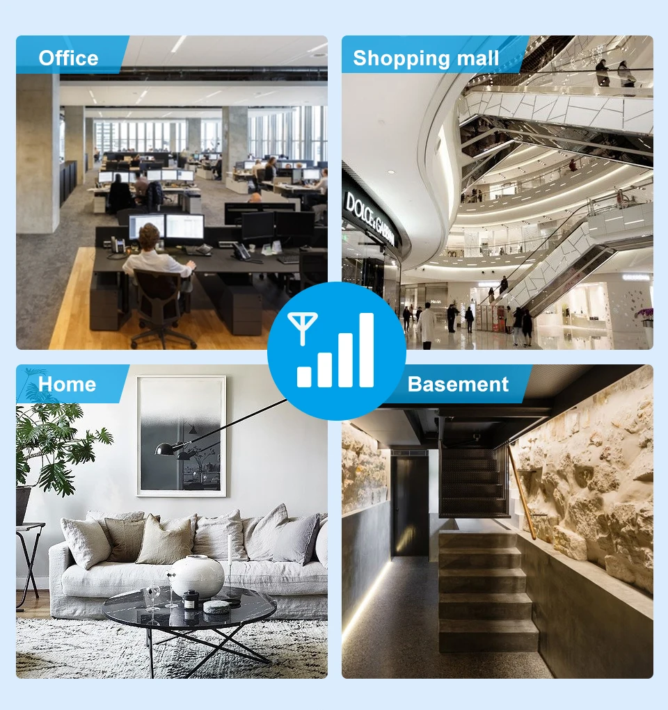 Возможность подключения 1-4 комнатных антенн одновременно, покрывает до 800 кв. М. 20 дБм большая мощность, расширение покрытия, более стабильная производительность.