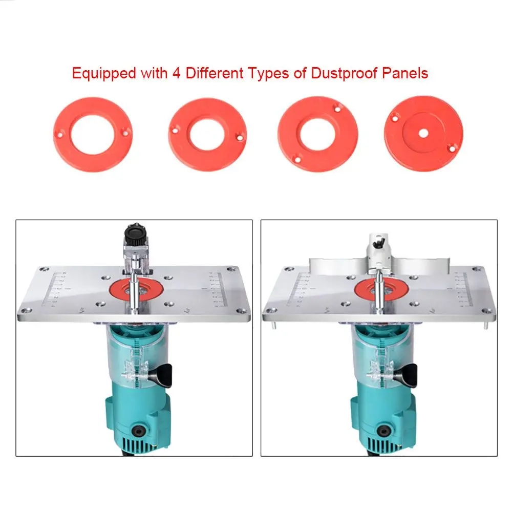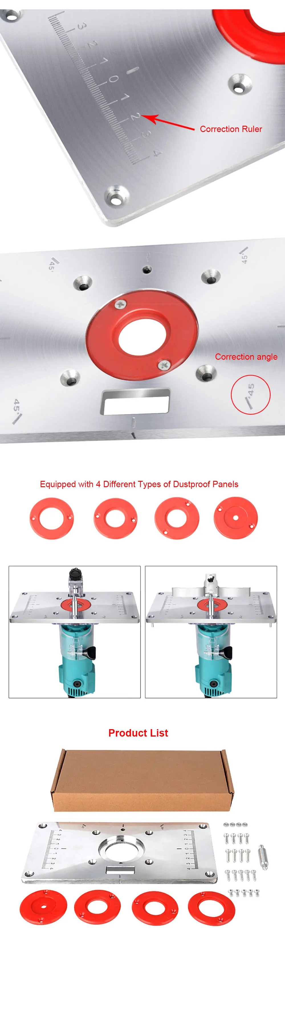 В том числе DIY Набор для подъема маршрутизатора, чтобы добавить функцию регулировки высоты для вашего погружного маршрутизатора (нужно сверлить отверстие в базе маршрутизатора самостоятельно). Многофункциональная вставная пластина с кольцами, подходит для изготовления собственного стола маршрутизатора для высокой точности обработки деревообработки.