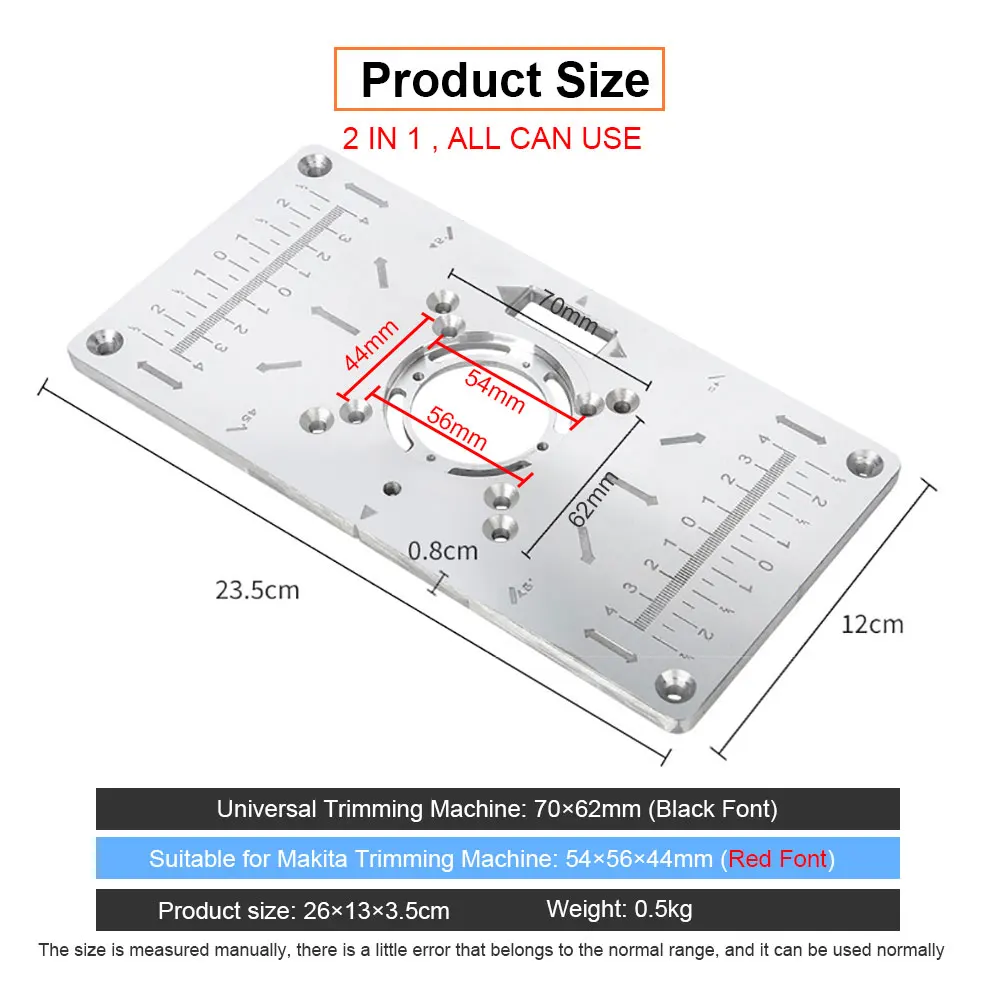 Многофункциональная вставная пластина с кольцами, подходит для изготовления собственного стола маршрутизатора для высокой точности обработки деревообработки.Изготовлен из прочного алюминиевого сплава для длительного использования.Удобная Втулка с центральным отверстием, используемая для маршрутизатора, поэтому она центрируется в отверстии для бит.Он прост в эксплуатации, экономит усилия и трудолюбие, а также легко манипулировать и расширить использование обрезки машины в то же время.Высокоточная обработка с ЧПУ делает идеальное качество.Материал: алюминиевый сплавМатериал: алюминиевый сплавПараметры продукта:2 в 1, все можно использовать1. Универсальный обрезной станок: 70 × 62 мм (черный шрифт)2. Подходит для станка для обрезки Makita: 54 × 56 × 44 мм (Красный шрифт)3. Размер изделия: 26 × 13 × 3,5 см4. Вес: 0,5 кгРазмер измеряется вручную, есть небольшая ошибка, которая относится к нормальному диапазону, и она может использоваться нормально