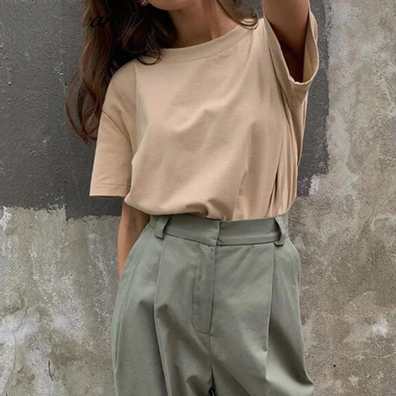 Летняя трикотажная Базовая Однотонная футболка, Женская Повседневна...