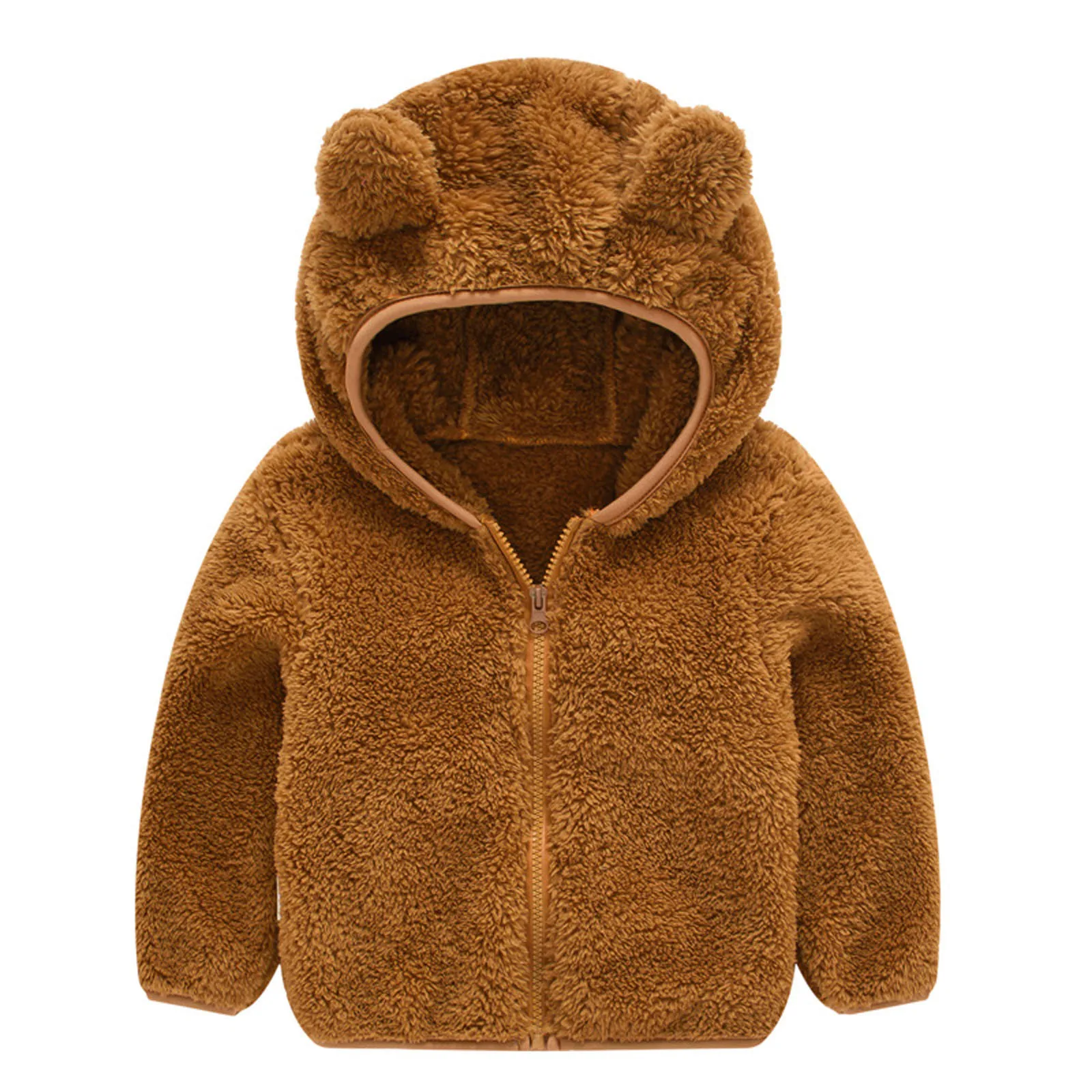 Куртка с капюшоном для маленьких мальчиков и девочек флисовая толстовка, зимний комбинезон, зимнее теплое пальтокомбинезон на молнии с милыми медвежьими ушками, комбинезон, одежда