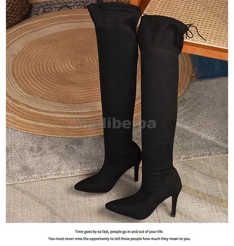 Женские сапоги выше колена, эластичная ткань, заостренный носок, вы...