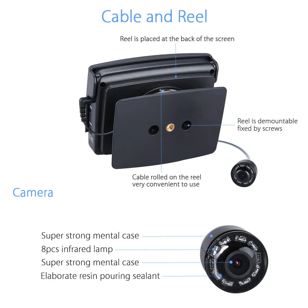 Спецификация камеры для поиска рыбы:1. Размер камеры: 35 мм x 23 мм2. Чехол для камеры Материал: прочный металлический чехол3. Материал стекла камеры: сапфировое стекло4. Размер датчика: 1/3 дюйма CMOS5. Общее количество пикселей: 1000 ТВЛ6. Угол обзора: 130 градусов7. Светодиодный светильник камеры: 8 шт. инфракрасный светодиодный S8. Длина кабеля: 15 м (30/40/50 до 80 м опционально)9. Рабочий ток камеры: 80 мА10. Источник питания камеры: 9 В постоянного тока11. Условия работы: под водой12. Уровень водонепроницаемости: IP68