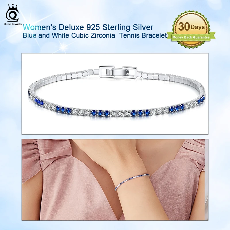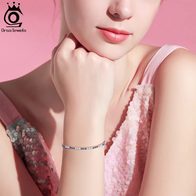 ORSA JEWELS роскошный 925 стерлингового серебра серебряный браслет для тенниса 2,0 мм синий и прозрачный кубический цирконий женский теннисный браслет ювелирные изделия SB117