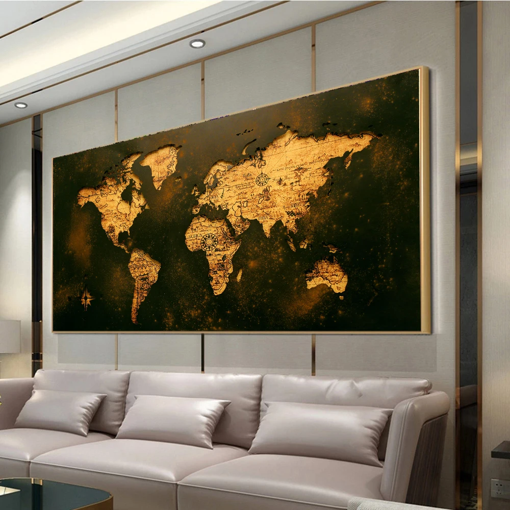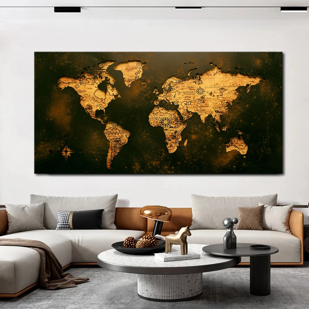 Современная художественная картина, черный золотой мир плакат-карта, принты, Настенная картина, Картина на холсте для гостиной, домашний Декор, живопись