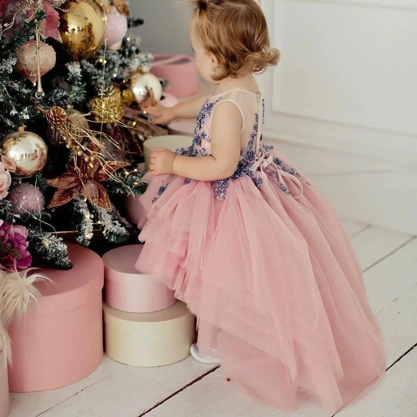 Милое платье принцессы с высоким и низким цветочным рисунком для девочек, с бусинами, иллюзионное детское платье на день рождения, на торжество, на Причастие, на свадьбу, вечеринку