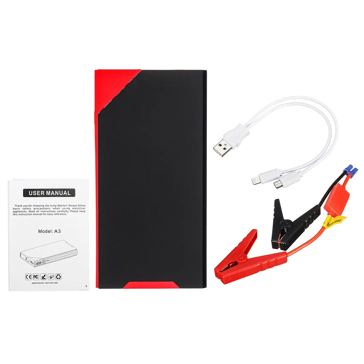 Посылка включает в себя:1 х автомобильный стартер2 x зажим для аккумулятора (черный + красный)1x2 в 1 мобильный телефон разъемы1 x Руководство пользователя
