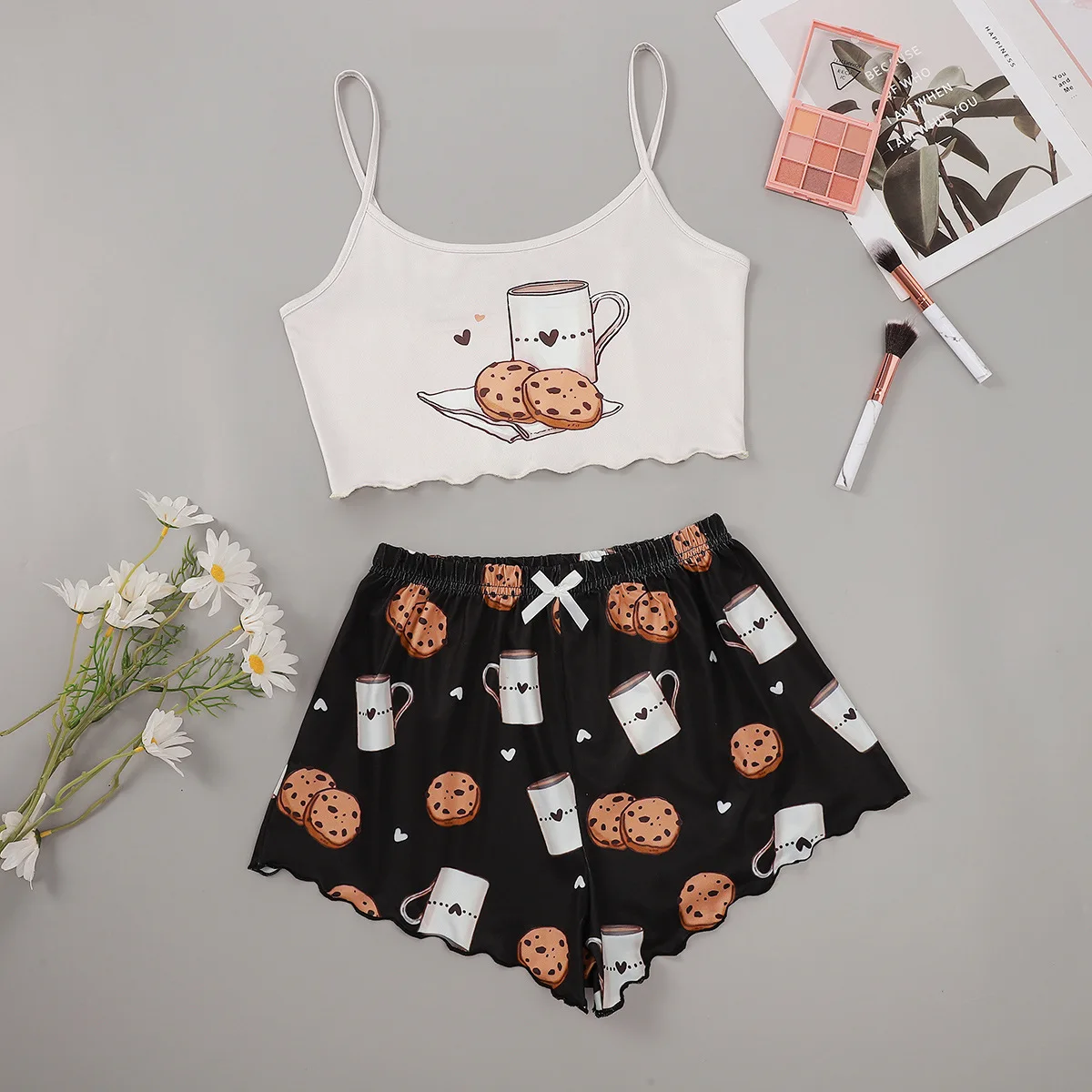 Пижама женская хлопковая, на тонких бретельках, с принтом печенья