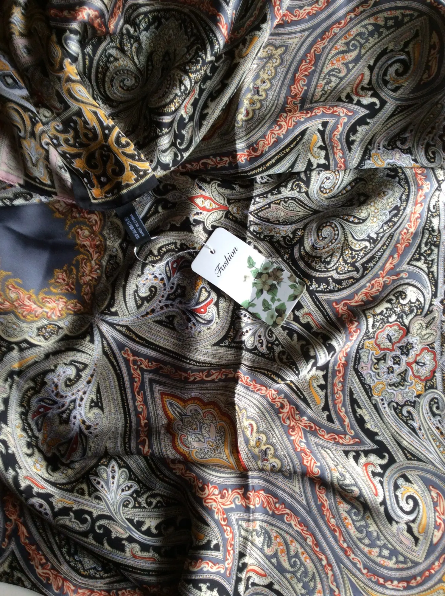 Шарф 90х180 см, полиэстер, приятный на ощупь, не очень тонкий, хорошо драпируется. Не просвечивает. Мне очень нравится узор, поэтому,купив,кашемировый платок 135х135 см с таким принтом, купила и этот шарф. За 369 руб. считаю,что удачная покупка. Пришел быстро (около 14 дн), в пункт выдачи. Спасибо продавцу!