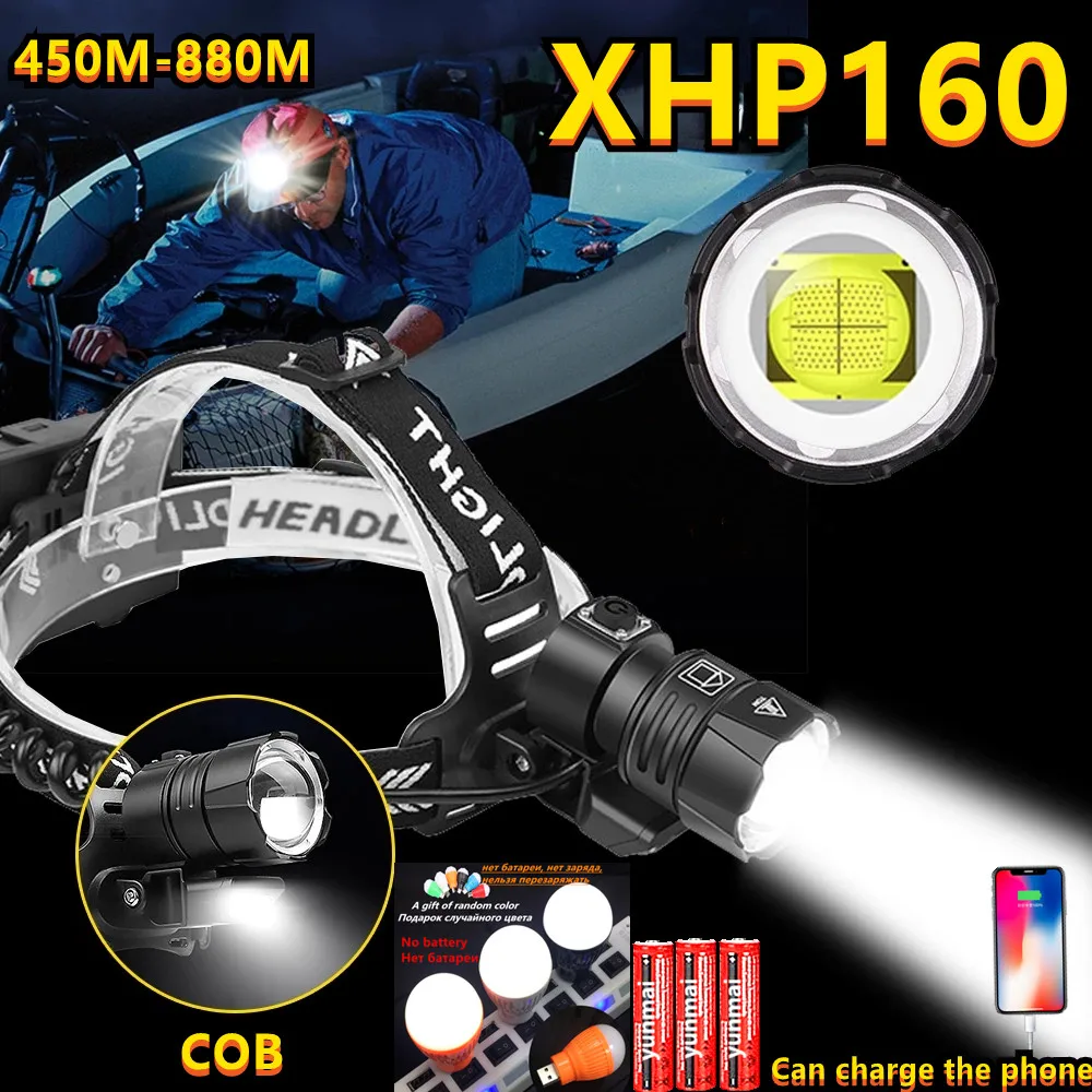 Новейший Мощный светодиодный налобный фонарь XHP160 18650, перезаряжаемый налобный фонарь, налобный фонарь XHP90, Usb, налсветильник фонарь, налобный фонарь
